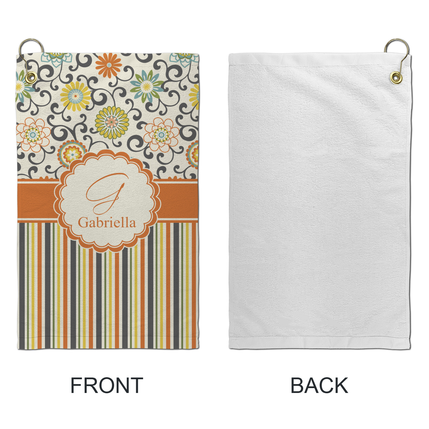 The design has a classic ribbon in orange trimmed in white. The decorative white scalloped label is trimmed in orange. Add an initial and a name for that personal touch to pull the entire design together.