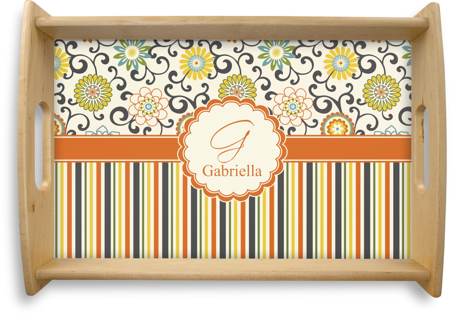 This serving tray with handles features square edges and two rounded sides, creating a very modern look. Each side is fabricated from a beautifully cut, natural wood. The bottom of the interior of the tray displays your customized design in bright, vibrant color. The tray is sold in both a black color and a natural wood look. Each variation of the wood serving tray has two sizes: Small, which is 14" x 10" x 2.25", and Large, which is 19.5" x 13.5" x 2.75".
