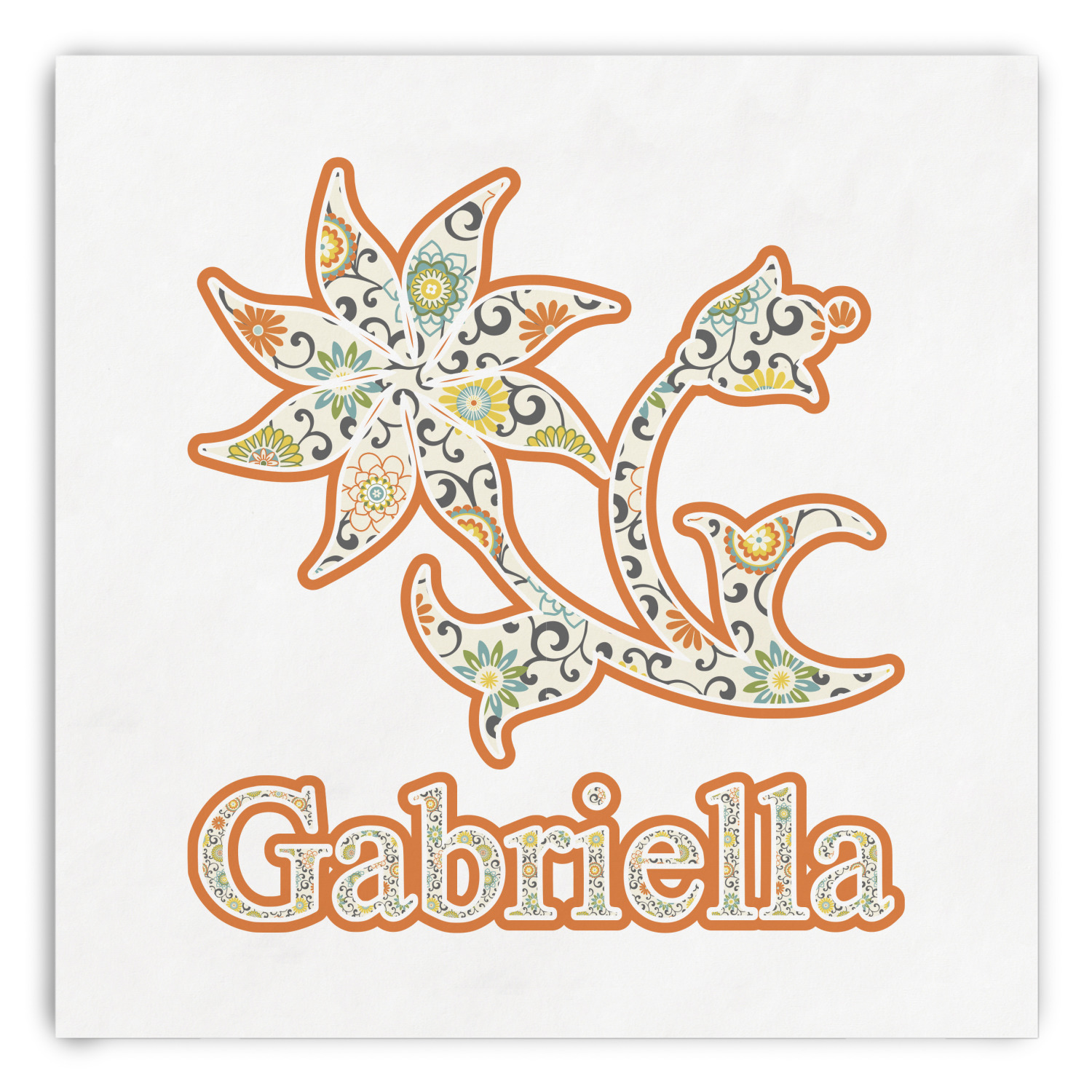 The design has a classic ribbon in orange trimmed in white. The decorative white scalloped label is trimmed in orange. Add an initial and a name for that personal touch to pull the entire design together.