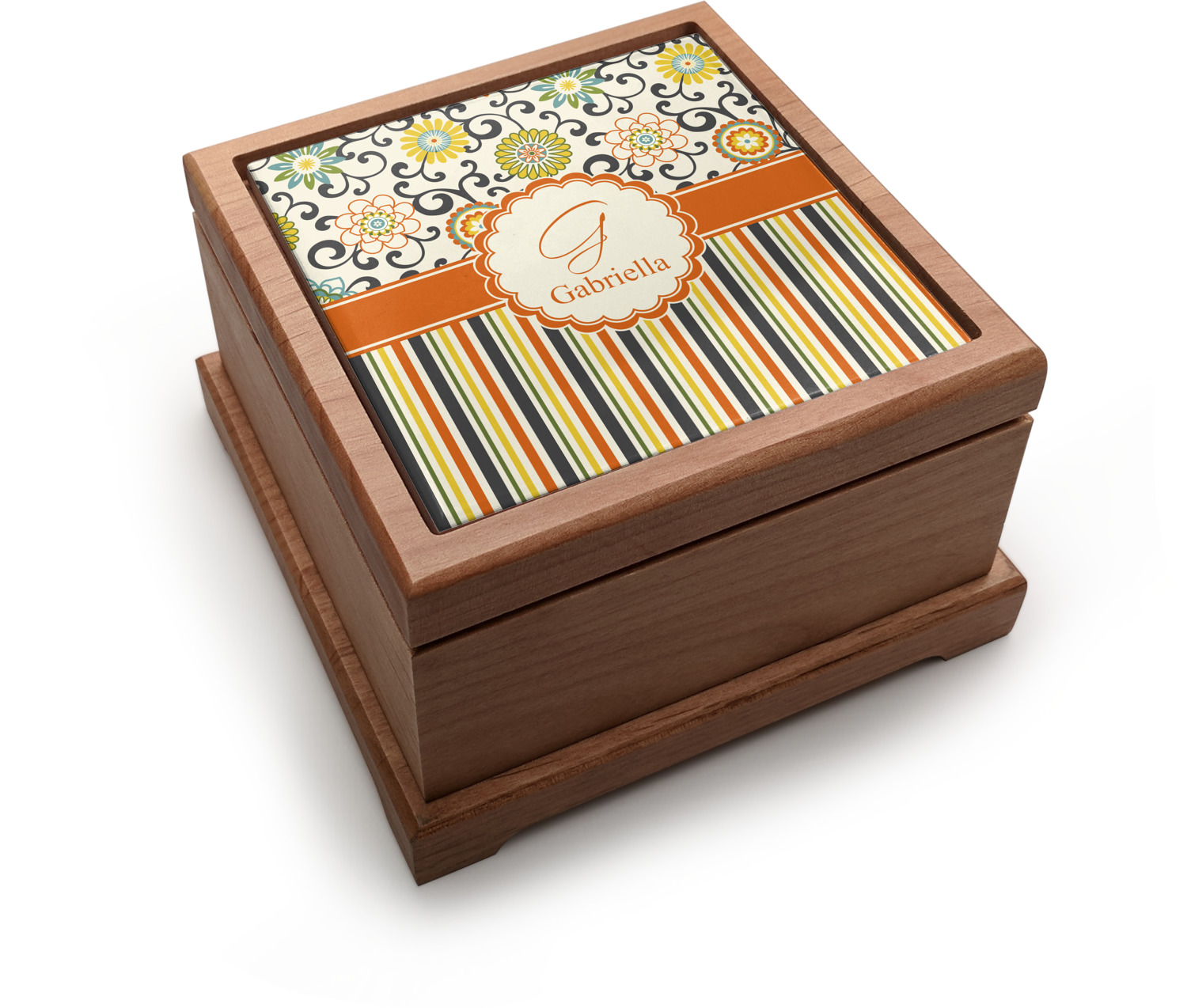 The design has a classic ribbon in orange trimmed in white. The decorative white scalloped label is trimmed in orange. Add an initial and a name for that personal touch to pull the entire design together.