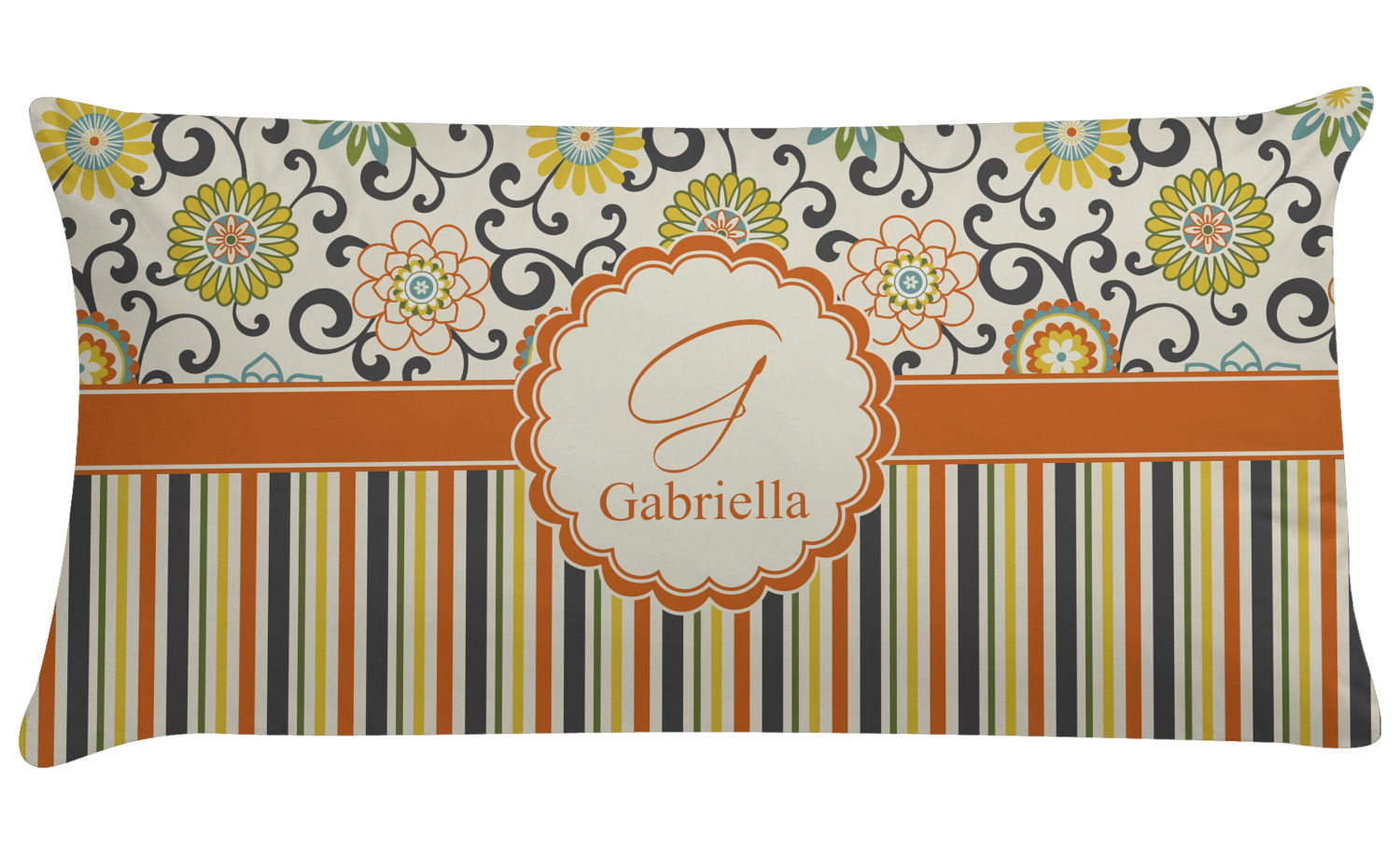 We have brought retro back to being relevant with this gorgeous swirls and floral pattern with a traditional stripe pairing. The top of the design renews the orange, green, blue, and yellow but adds a modern twist by using dark gray. The floral pattern is set on a background of white to make this print come to life. The bottom of the design has the classic stripe print using coordinating colors from the floral pattern