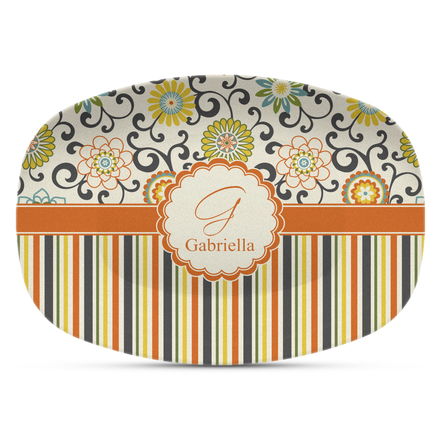 We have brought retro back to being relevant with this gorgeous swirls and floral pattern with a traditional stripe pairing. The top of the design renews the orange, green, blue, and yellow but adds a modern twist by using dark gray. The floral pattern is set on a background of white to make this print come to life. The bottom of the design has the classic stripe print using coordinating colors from the floral pattern