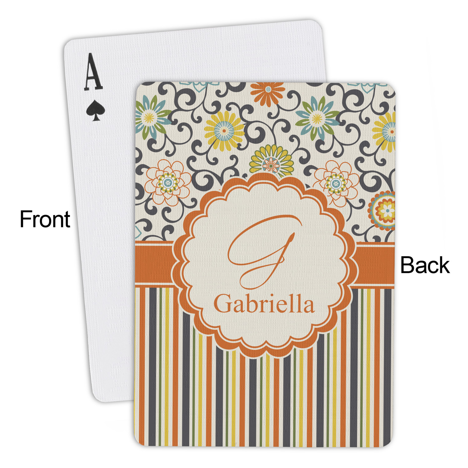 The customization / personalization is printed on the back side. The playing cards have a low gloss coating on both sides. The cards are packaged in a clear plastic box.