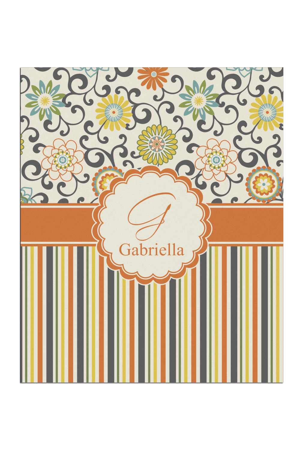 We have brought retro back to being relevant with this gorgeous swirls and floral pattern with a traditional stripe pairing. The top of the design renews the orange, green, blue, and yellow but adds a modern twist by using dark gray. The floral pattern is set on a background of white to make this print come to life. The bottom of the design has the classic stripe print using coordinating colors from the floral pattern