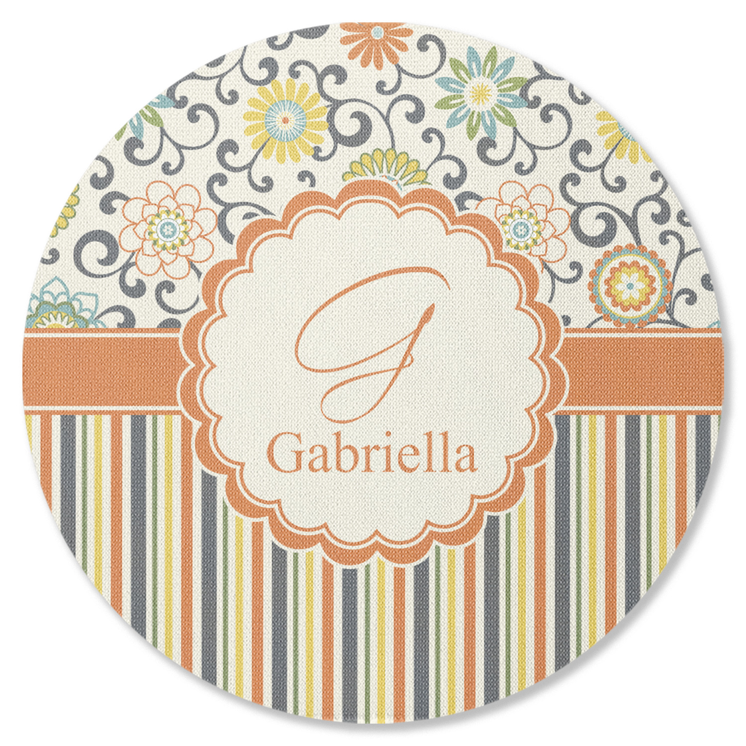The design has a classic ribbon in orange trimmed in white. The decorative white scalloped label is trimmed in orange. Add an initial and a name for that personal touch to pull the entire design together.