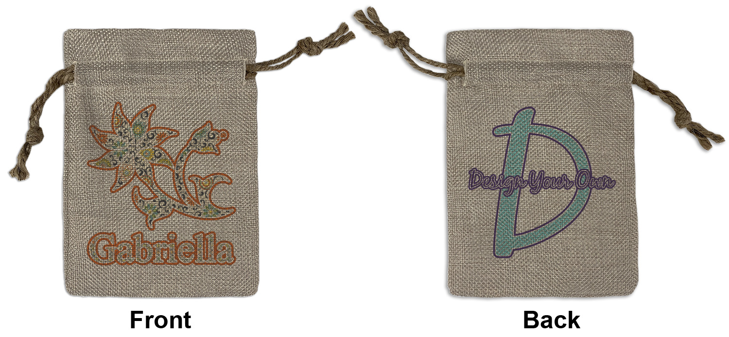 We sell our Burlap Gift Bags in 3 variant sized bags. Made with burlap polyester, each personalized bag can be secured with a twine drawstring pull. Your custom design is available to print on one side or both sides - completely up to you! The sizes of the bags measure approximately 4.5" x 6.5" for the smallest size, 6.5" x 8.0" for the medium size, and 6.5" x 13.5" for the large-sized bag.