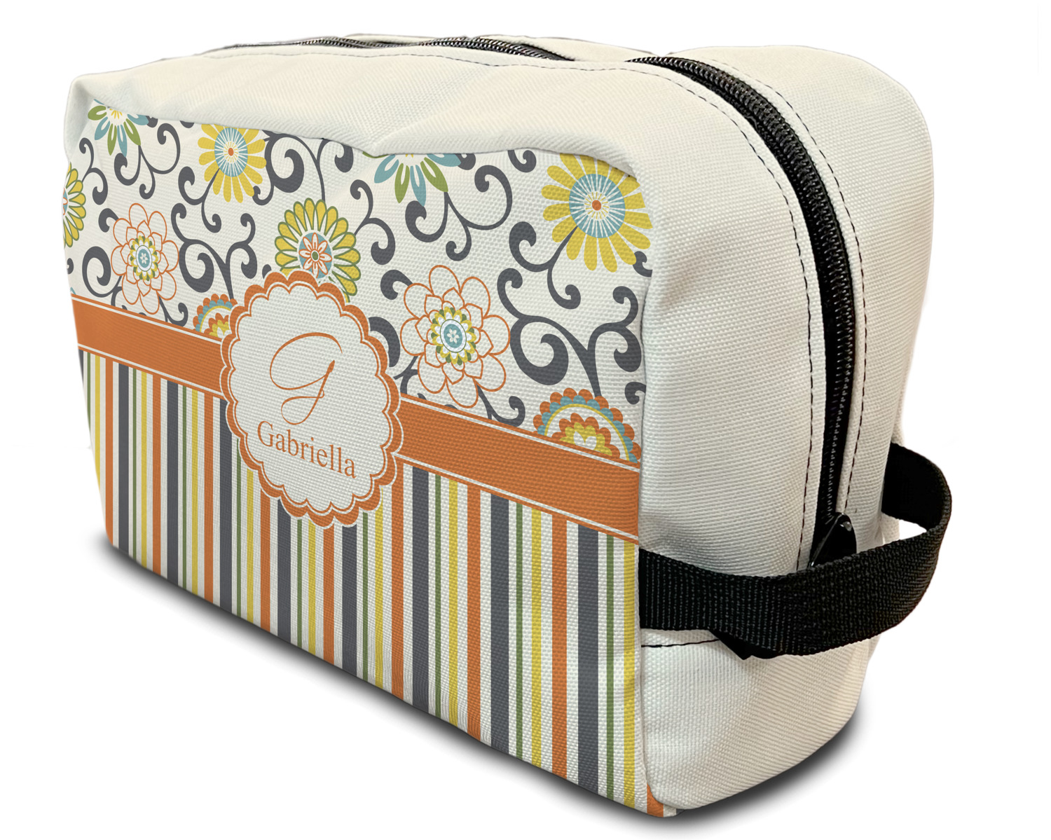 Our toiletry bag has the traditional dopp kit design i.e. a side to side zippered closure, giving you easy access to all the contents inside and a sturdy handle on one side of the bag. The canvas fabric for dopp kits is printed, then cut and sewn here in the USA.