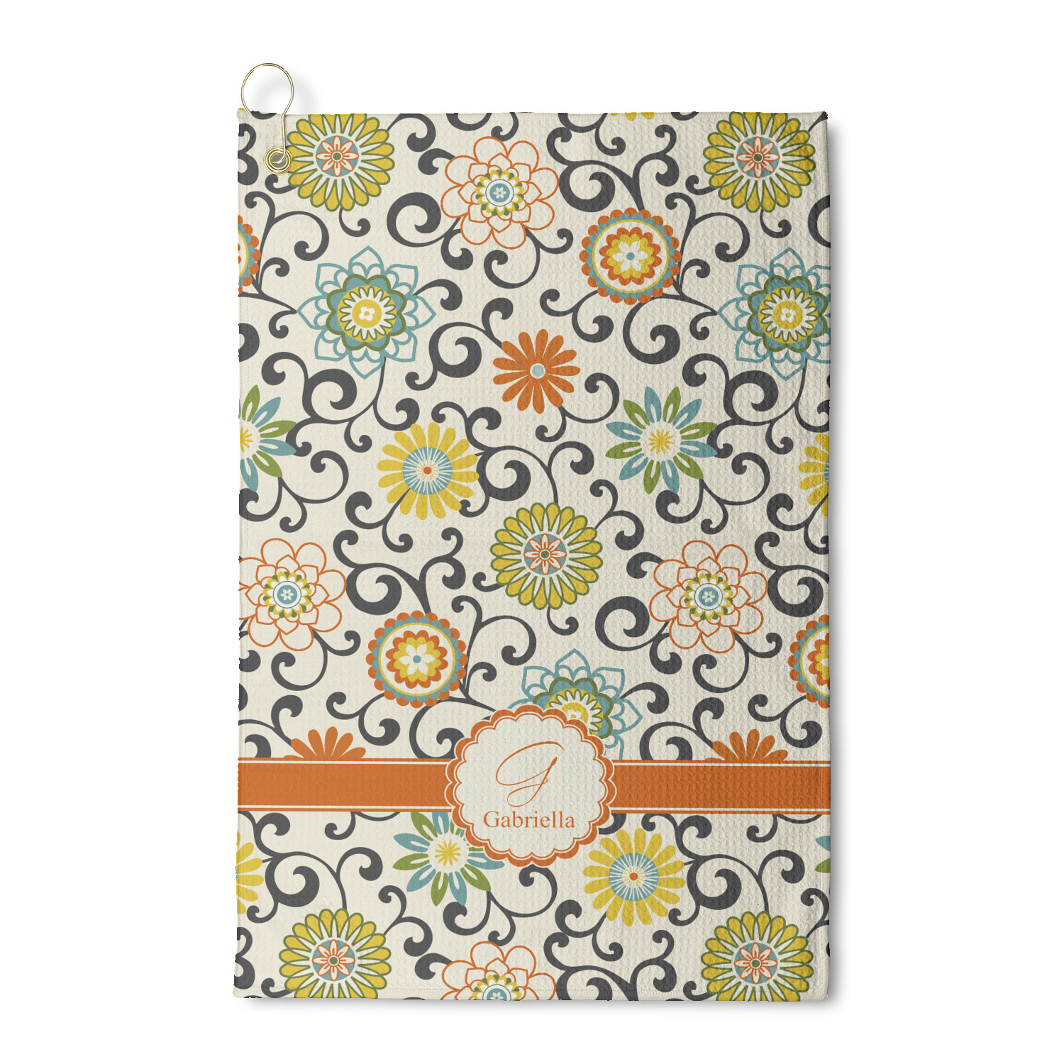 In this floral design the flowers of orange, green, blue, and yellow are connected with swirls of dark gray. The design has a classic ribbon in orange trimmed in off white. The decorative off white scalloped label is trimmed in orange. Add an initial and a name for that personal touch to pull the entire design together.