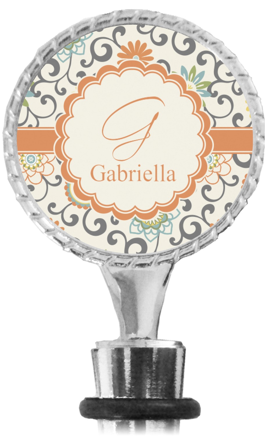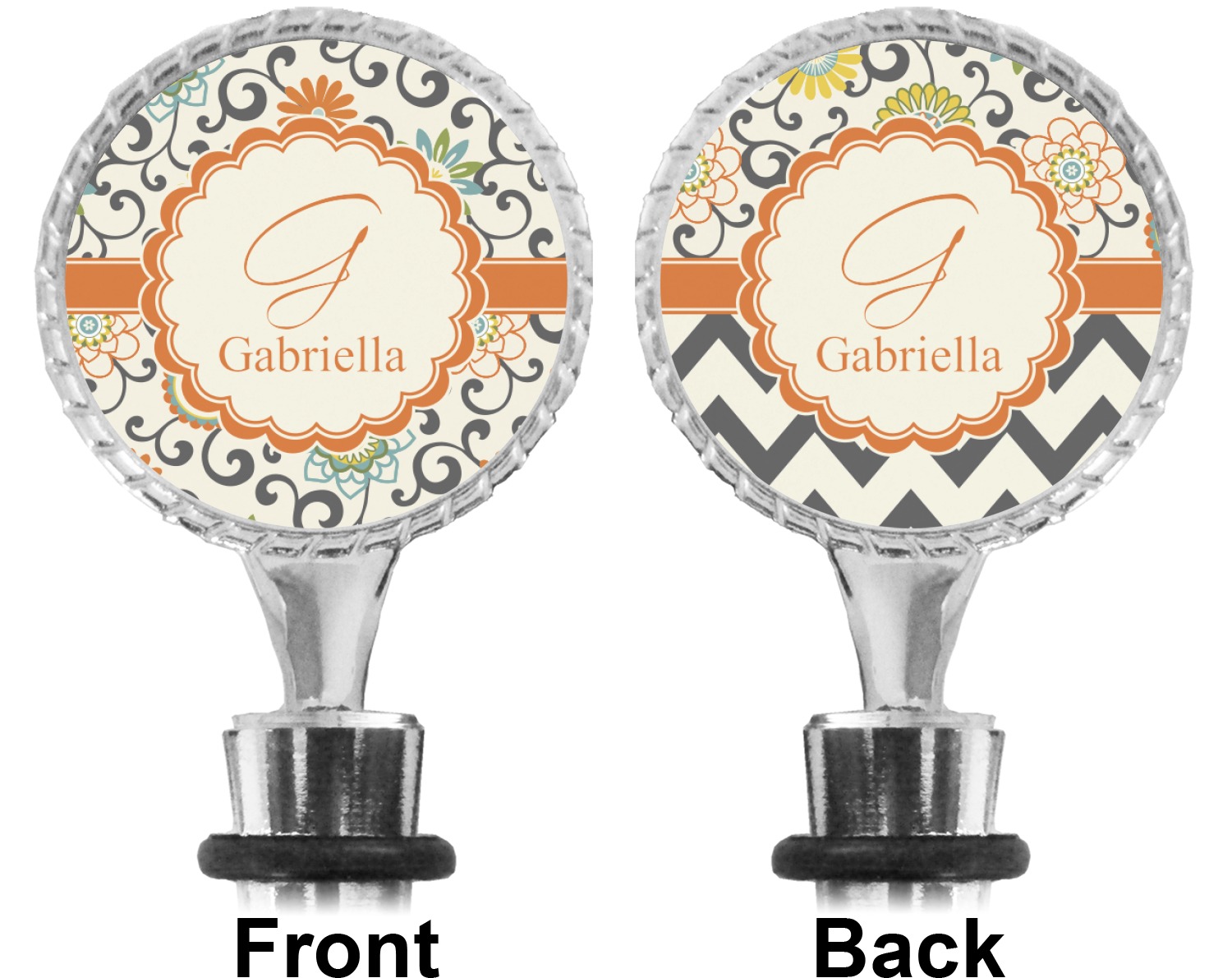 The top part of your bottle stopper is comprised of a zinc ring that displays your customization(s) in its middle, on both sides. The ring is heavy duty, with a bright chrome finish. The body of the wine stoppers have two silicone rings to provide an airtight seal. These wine bottle stoppers measure at 1.625" L x 0.8125" W x 4.625" H; your custom wine stopper is meant to fit into most standard-sized wine bottles.