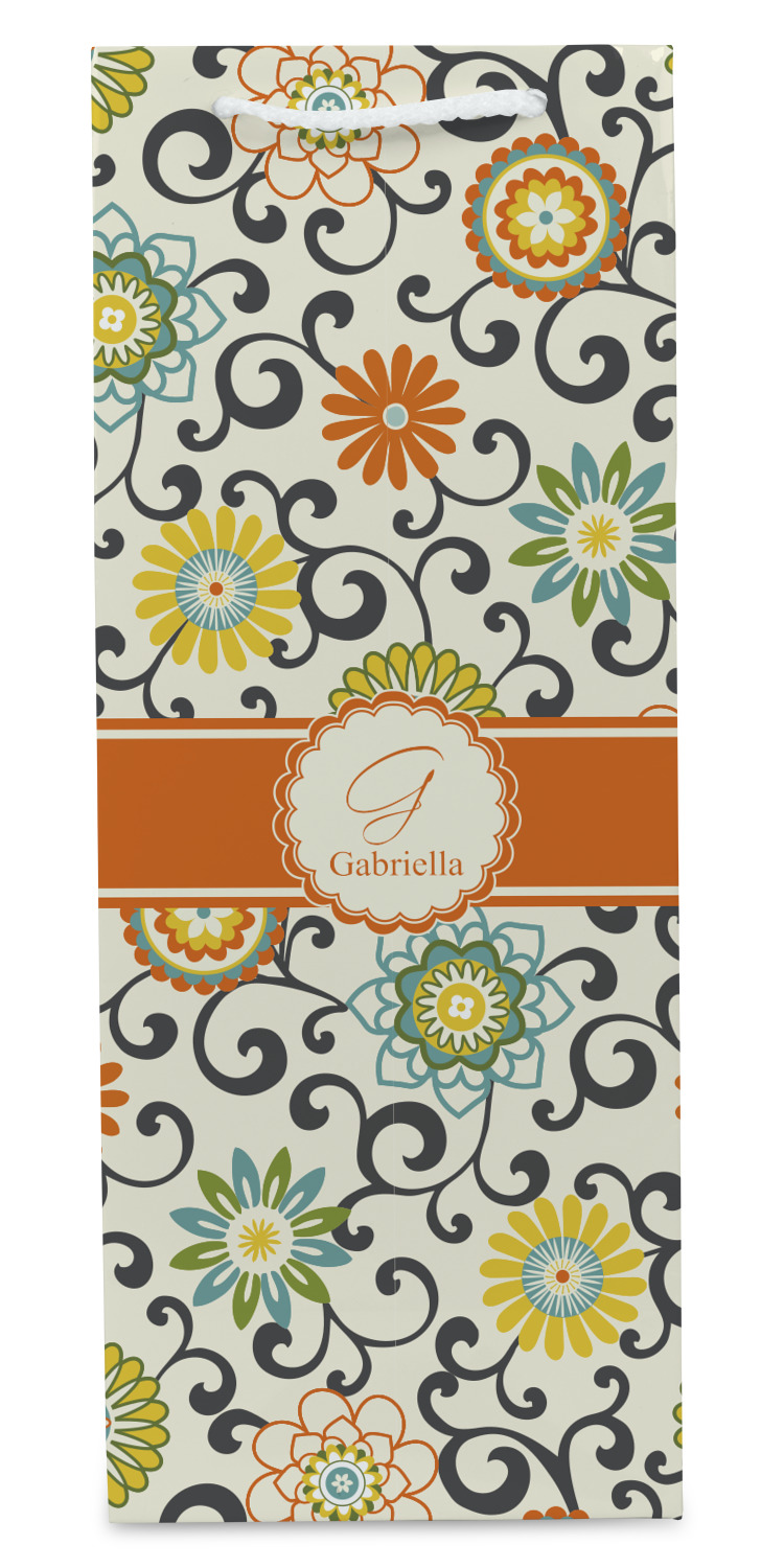 In this floral design the flowers of orange, green, blue, and yellow are connected with swirls of dark gray. The design has a classic ribbon in orange trimmed in off white. The decorative off white scalloped label is trimmed in orange. Add an initial and a name for that personal touch to pull the entire design together.