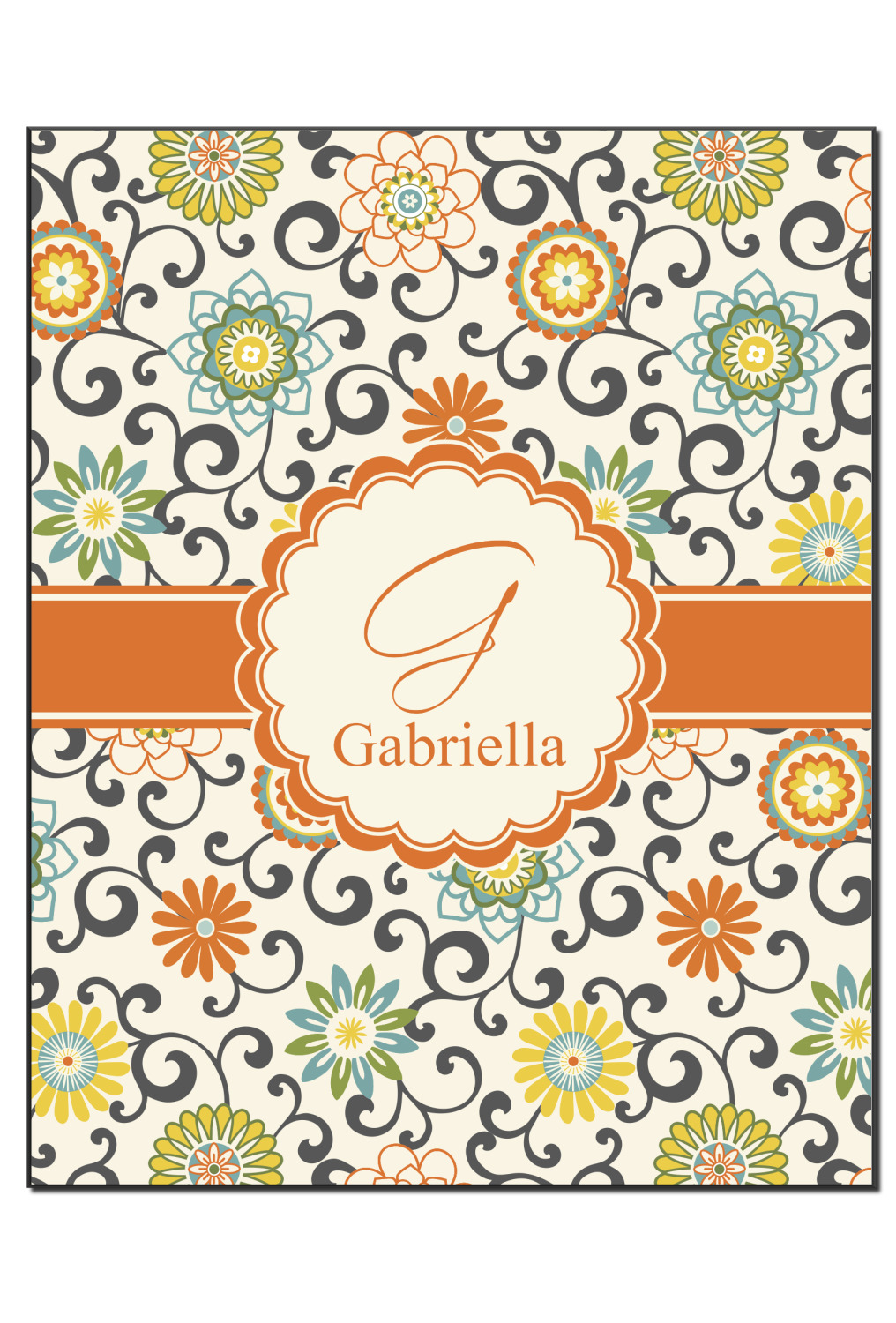 In this floral design the flowers of orange, green, blue, and yellow are connected with swirls of dark gray. The design has a classic ribbon in orange trimmed in off white. The decorative off white scalloped label is trimmed in orange. Add an initial and a name for that personal touch to pull the entire design together.