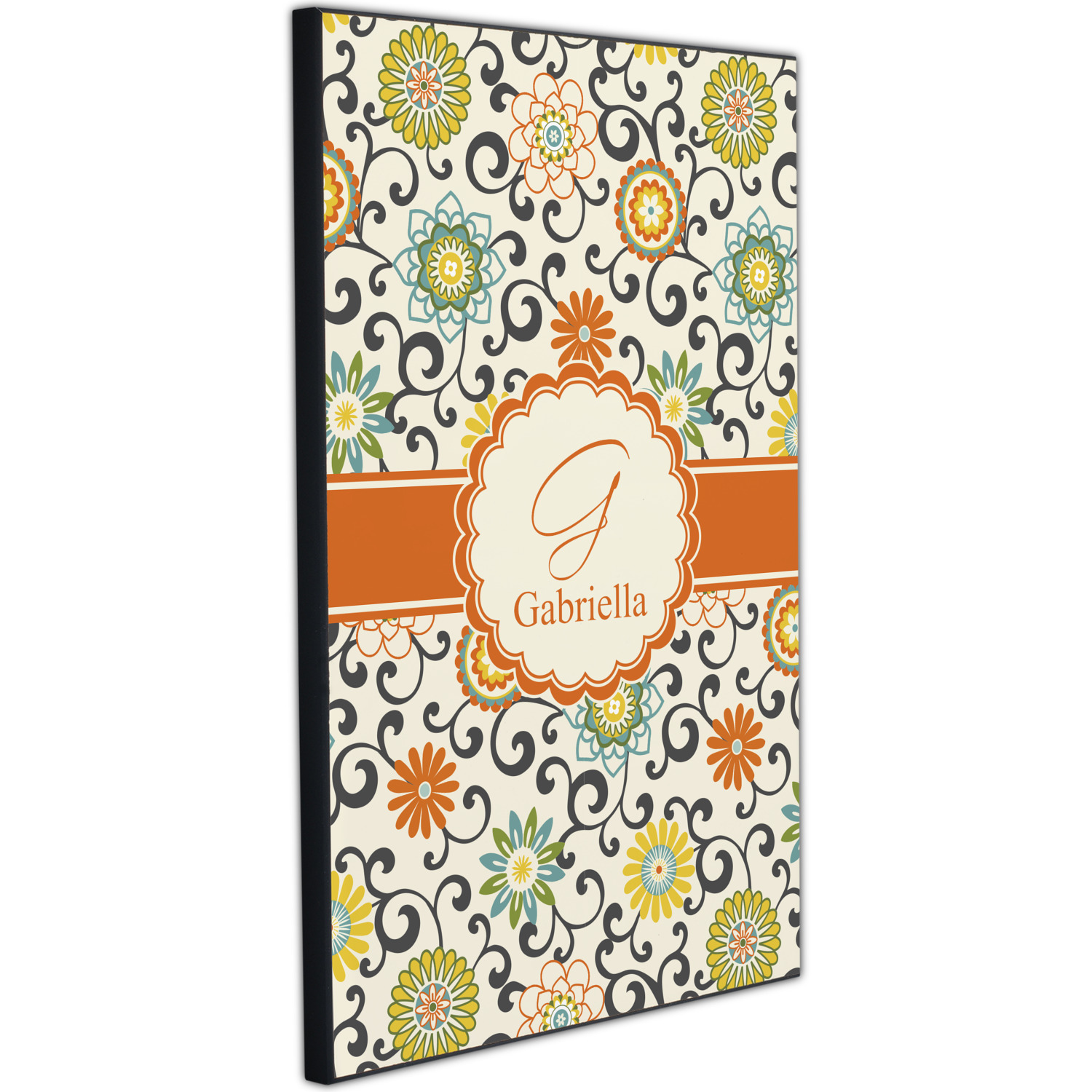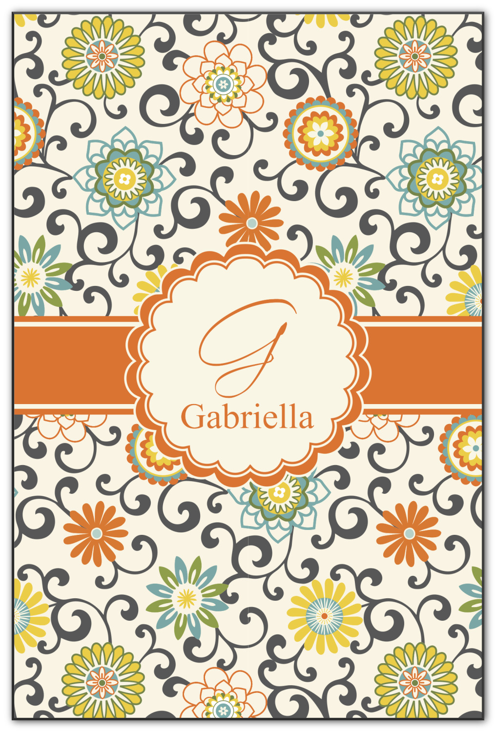 In this floral design the flowers of orange, green, blue, and yellow are connected with swirls of dark gray. The design has a classic ribbon in orange trimmed in off white. The decorative off white scalloped label is trimmed in orange. Add an initial and a name for that personal touch to pull the entire design together.