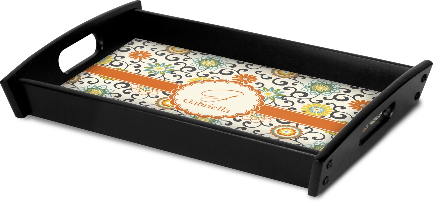 This serving tray with handles features square edges and two rounded sides, creating a very modern look. Each side is fabricated from a beautifully cut, natural wood. The bottom of the interior of the tray displays your customized design in bright, vibrant color. The tray is sold in both a black color and a natural wood look. Each variation of the wood serving tray has two sizes: Small, which is 14" x 10" x 2.25", and Large, which is 19.5" x 13.5" x 2.75".