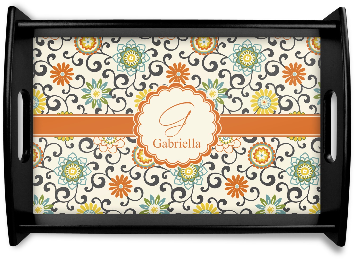 In this floral design the flowers of orange, green, blue, and yellow are connected with swirls of dark gray. The design has a classic ribbon in orange trimmed in off white. The decorative off white scalloped label is trimmed in orange. Add an initial and a name for that personal touch to pull the entire design together.