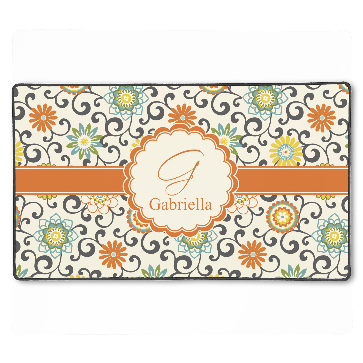 In this floral design the flowers of orange, green, blue, and yellow are connected with swirls of dark gray. The design has a classic ribbon in orange trimmed in off white. The decorative off white scalloped label is trimmed in orange. Add an initial and a name for that personal touch to pull the entire design together.