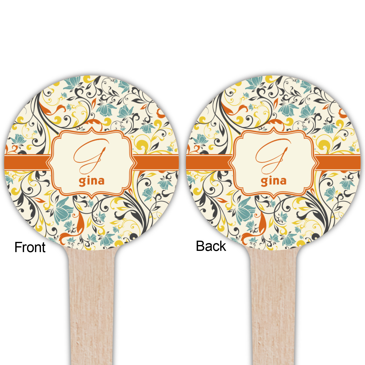 The design combines green, blue, and yellow flowers with swirls of black. The floral pattern is set on a background of white to showcase the print. The design has a classic ribbon in orange trimmed in white. The decorative white label is trimmed in orange. Add an initial and a name for that personal touch to pull the entire design together.