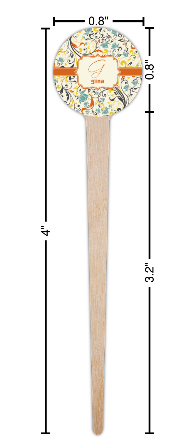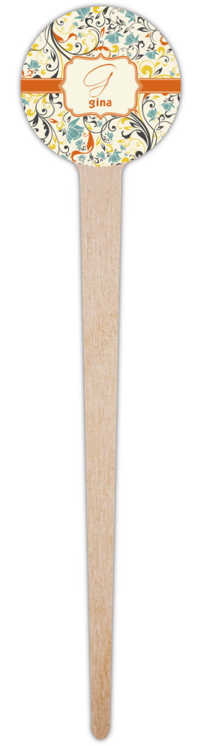 The design combines green, blue, and yellow flowers with swirls of black. The floral pattern is set on a background of white to showcase the print. The design has a classic ribbon in orange trimmed in white. The decorative white label is trimmed in orange. Add an initial and a name for that personal touch to pull the entire design together.