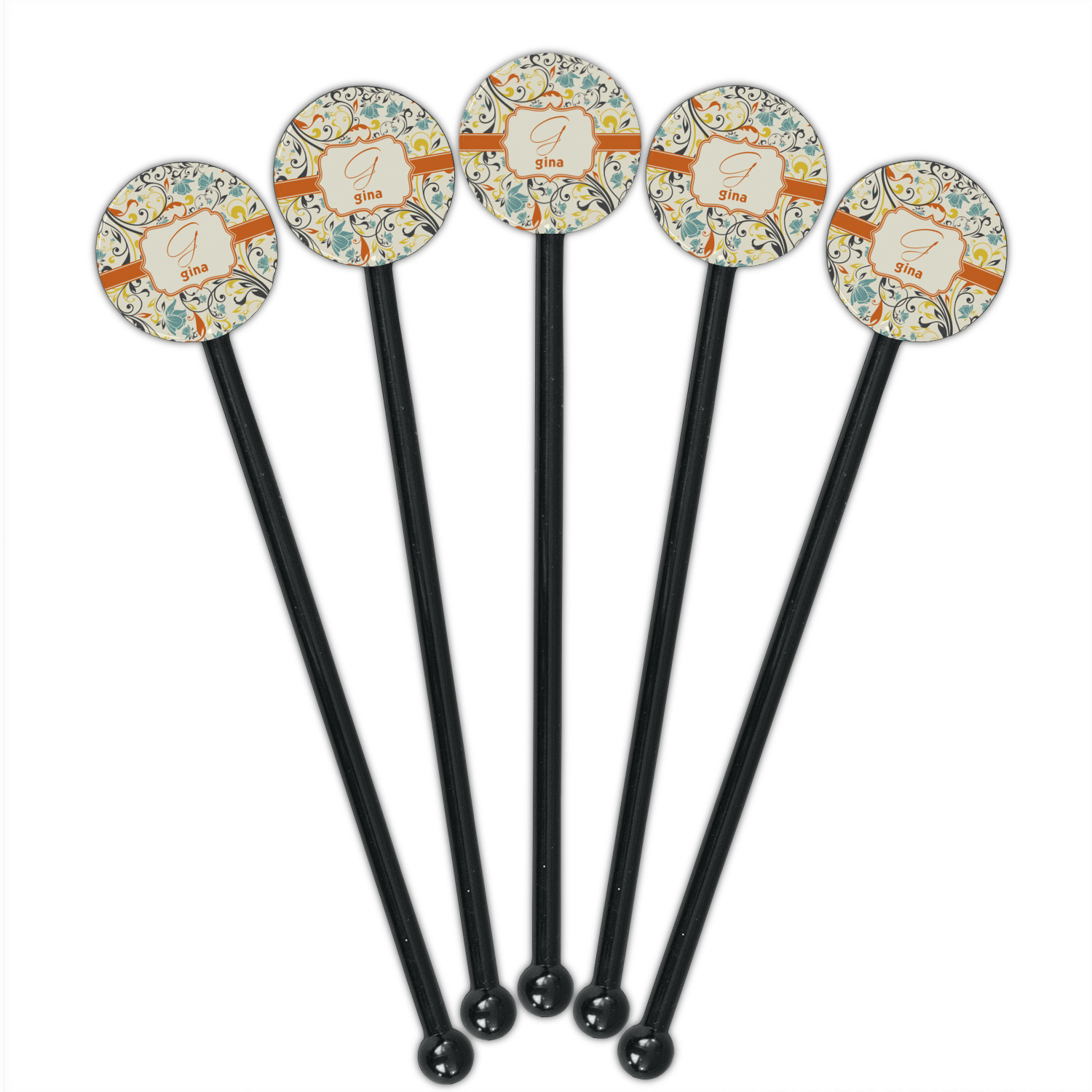 The design combines green, blue, and yellow flowers with swirls of black. The floral pattern is set on a background of white to showcase the print. The design has a classic ribbon in orange trimmed in white. The decorative white label is trimmed in orange. Add an initial and a name for that personal touch to pull the entire design together.