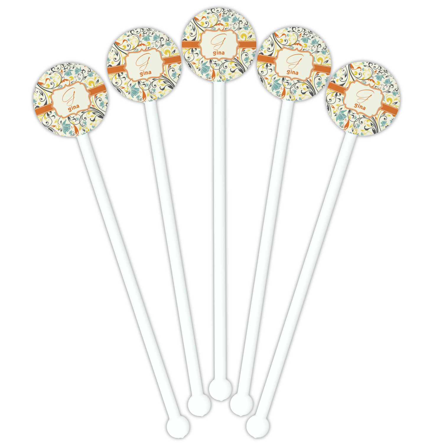 The design combines green, blue, and yellow flowers with swirls of black. The floral pattern is set on a background of white to showcase the print. The design has a classic ribbon in orange trimmed in white. The decorative white label is trimmed in orange. Add an initial and a name for that personal touch to pull the entire design together.