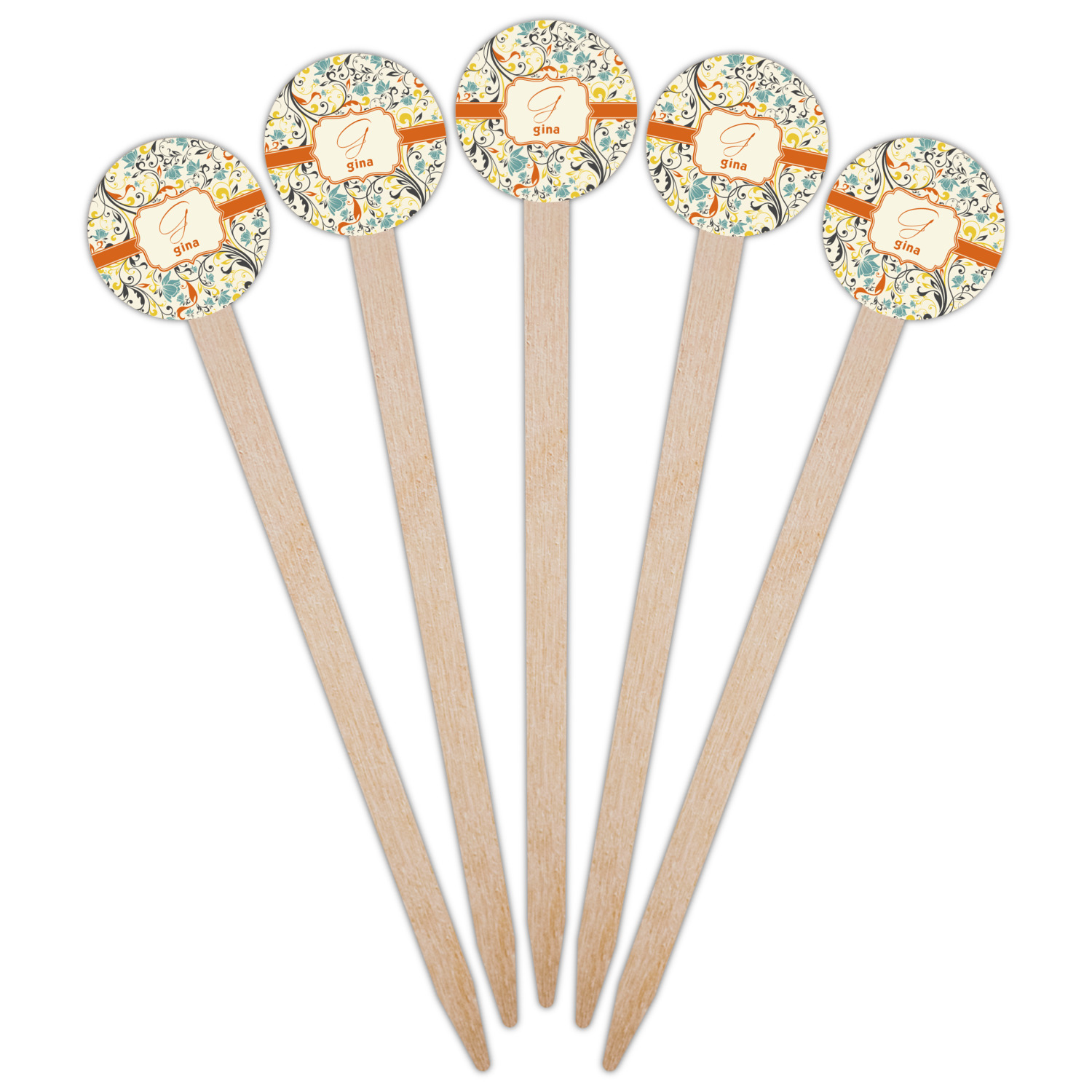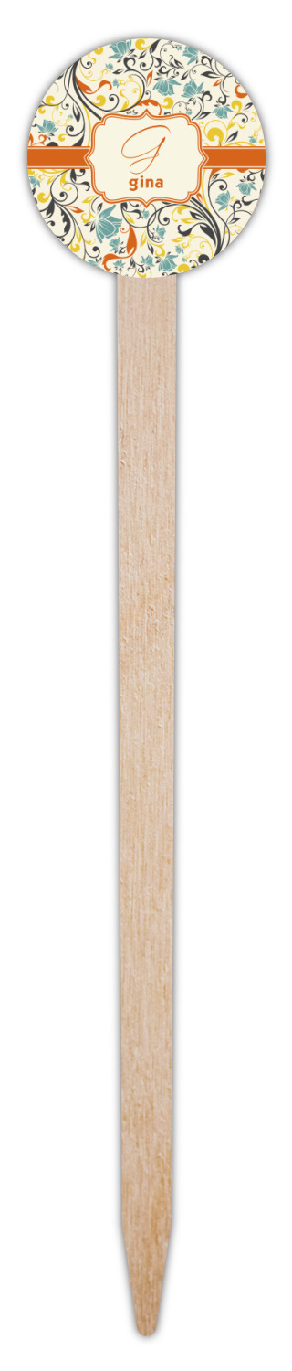 The design combines green, blue, and yellow flowers with swirls of black. The floral pattern is set on a background of white to showcase the print. The design has a classic ribbon in orange trimmed in white. The decorative white label is trimmed in orange. Add an initial and a name for that personal touch to pull the entire design together.