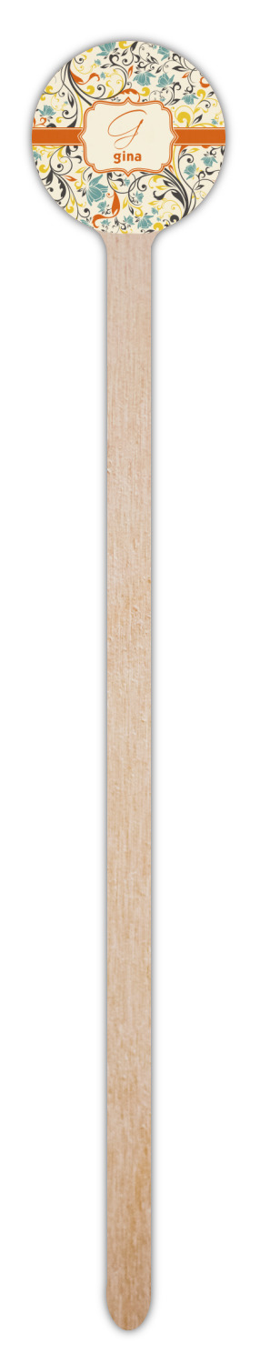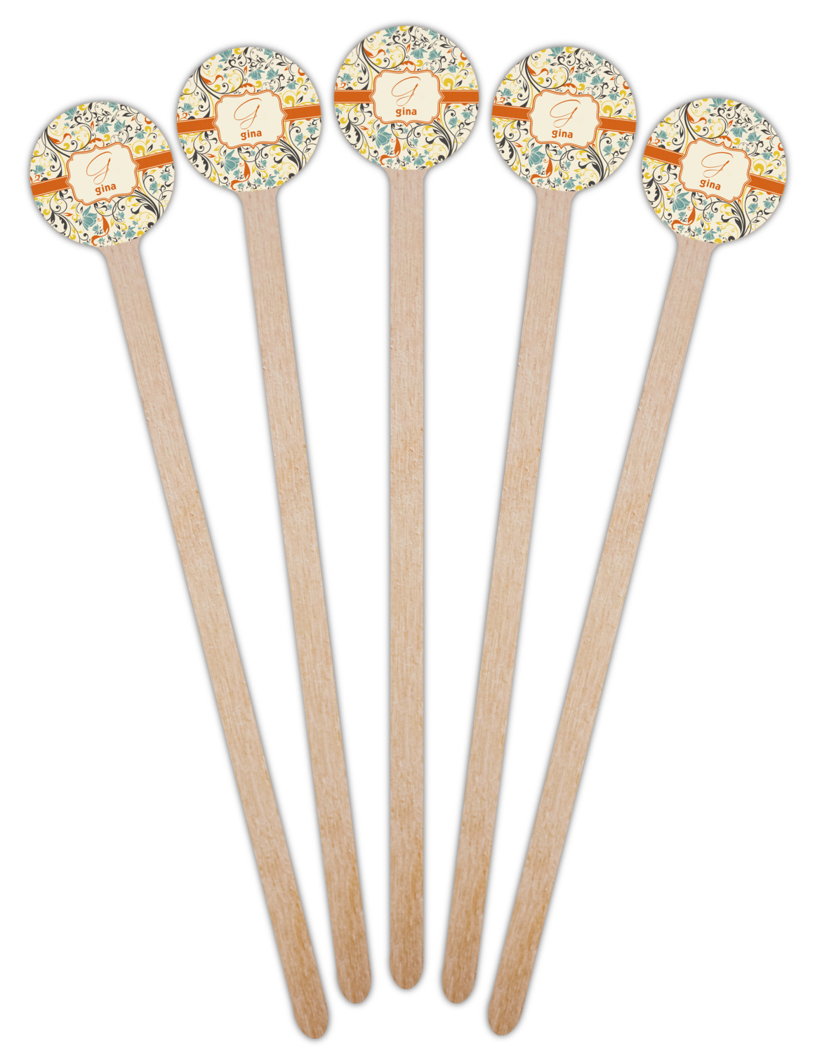 The design combines green, blue, and yellow flowers with swirls of black. The floral pattern is set on a background of white to showcase the print. The design has a classic ribbon in orange trimmed in white. The decorative white label is trimmed in orange. Add an initial and a name for that personal touch to pull the entire design together.
