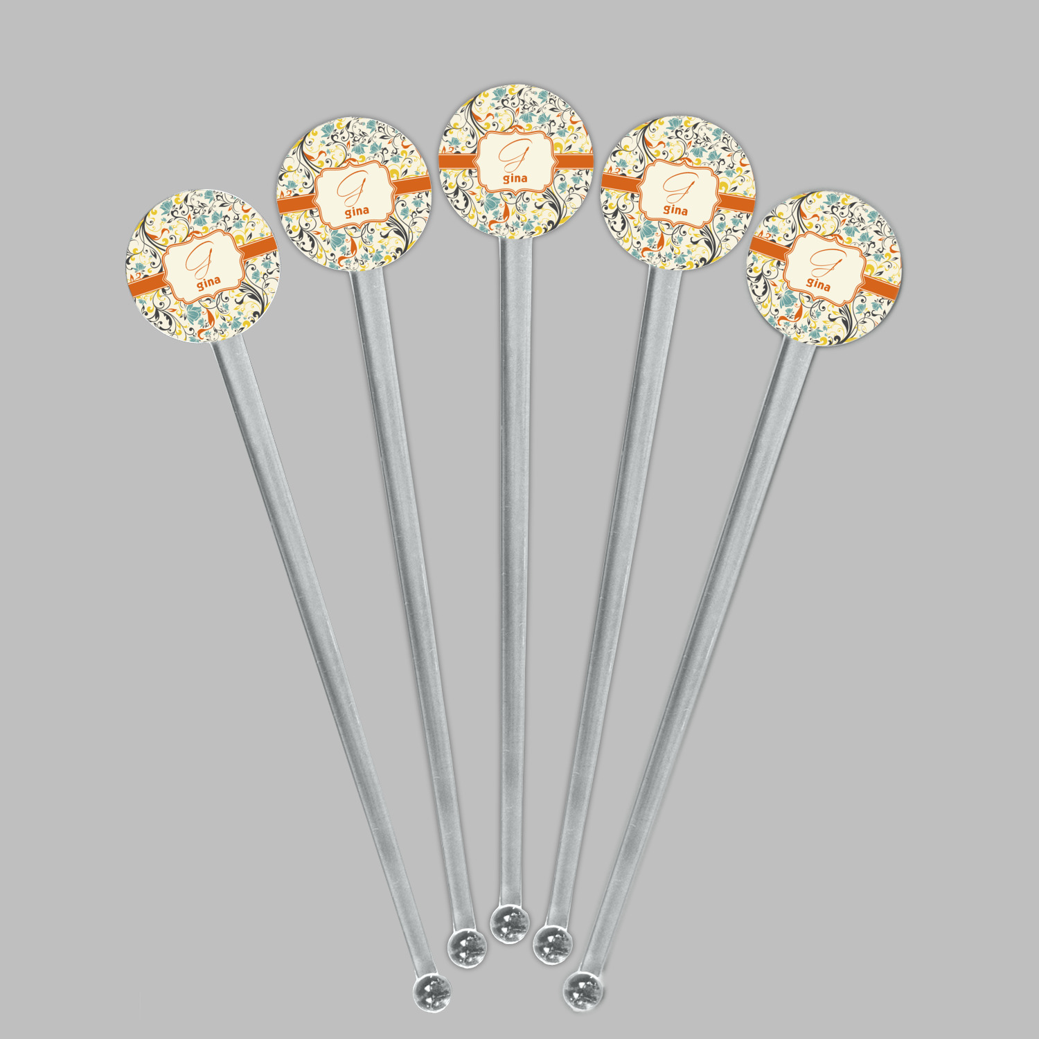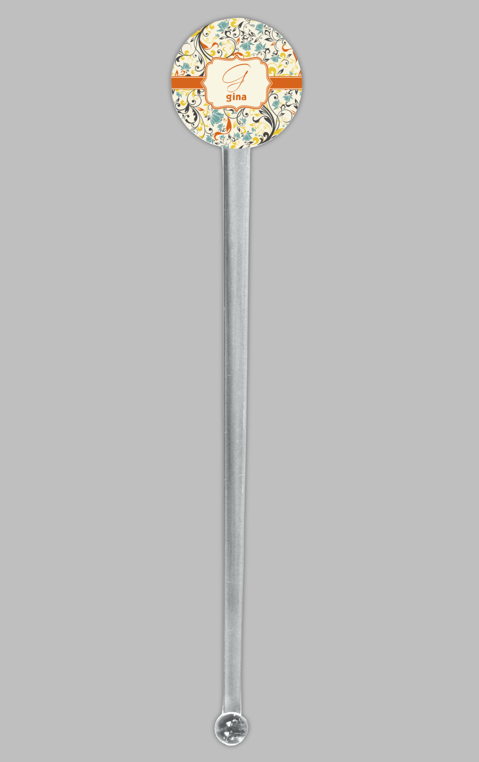 The design combines green, blue, and yellow flowers with swirls of black. The floral pattern is set on a background of white to showcase the print. The design has a classic ribbon in orange trimmed in white. The decorative white label is trimmed in orange. Add an initial and a name for that personal touch to pull the entire design together.
