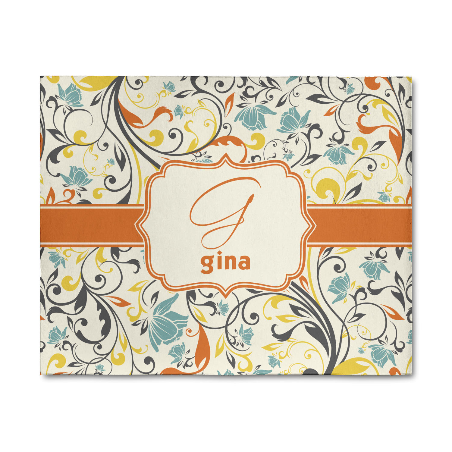 The design combines green, blue, and yellow flowers with swirls of black. The floral pattern is set on a background of white to showcase the print. The design has a classic ribbon in orange trimmed in white. The decorative white label is trimmed in orange. Add an initial and a name for that personal touch to pull the entire design together.