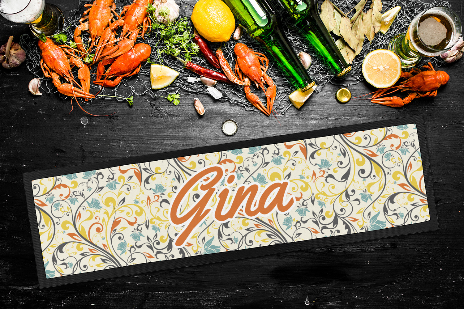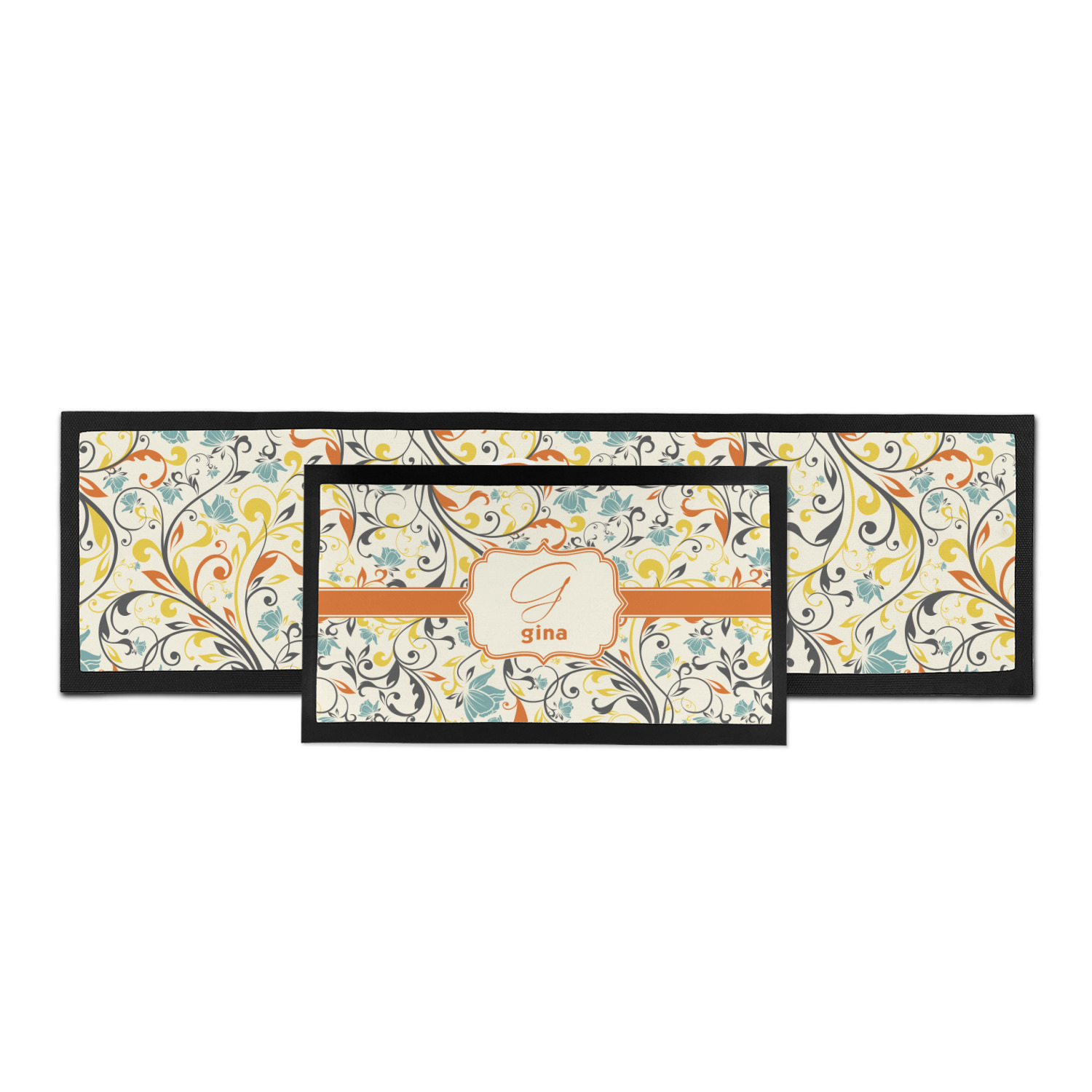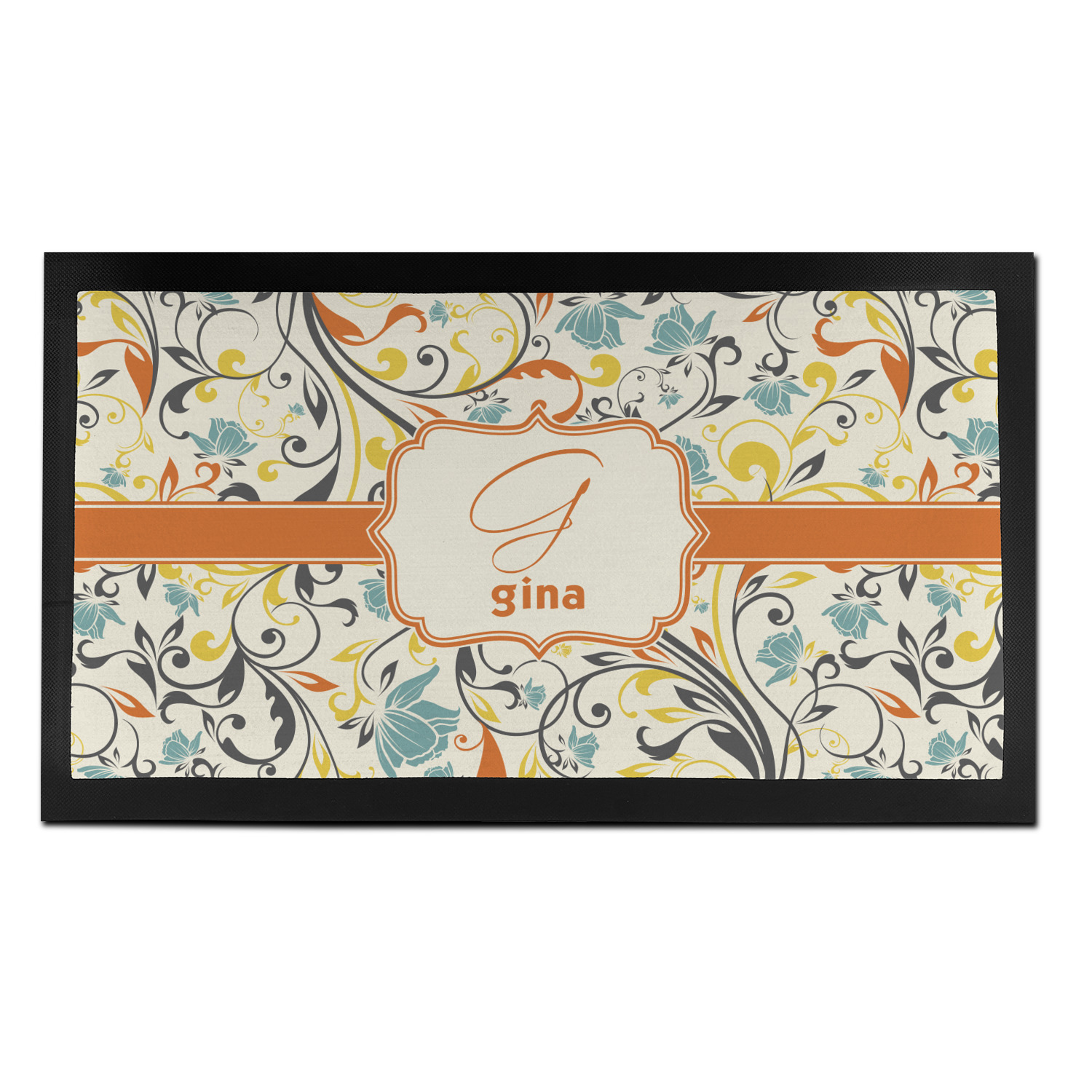 The design combines green, blue, and yellow flowers with swirls of black. The floral pattern is set on a background of white to showcase the print. The design has a classic ribbon in orange trimmed in white. The decorative white label is trimmed in orange. Add an initial and a name for that personal touch to pull the entire design together.