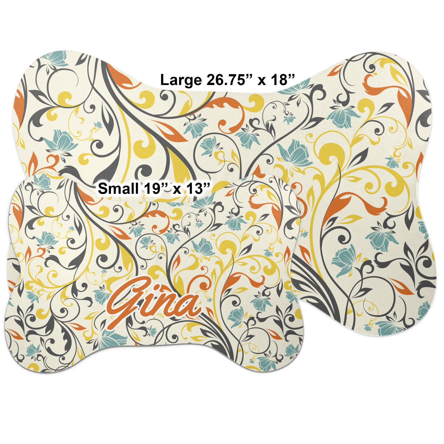 The top of this mat displays your custom design, as it is printed on polyester. To prevent slippage, the underside of the mat is made of rubber. We offer a small dog food mat, suitable for smaller dogs and a large dog food mat for bigger breeds. The small dog food mat is approximately 19 by 13 inches, while the large dog feeding mat measures at approximately 26.75 by 18 inches. Both personalized mats are ideally sized to fit two dog bowls.