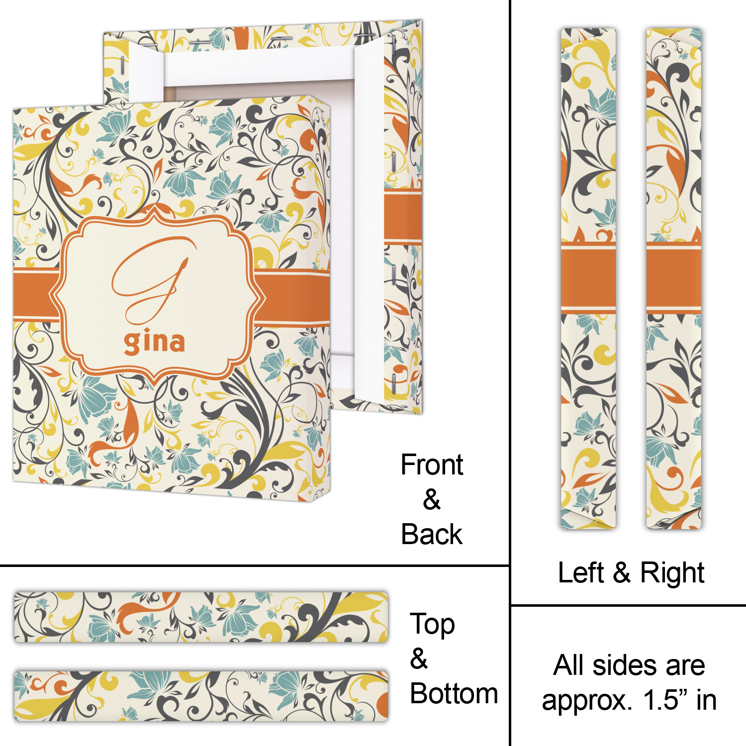 The design combines green, blue, and yellow flowers with swirls of black. The floral pattern is set on a background of white to showcase the print. The design has a classic ribbon in orange trimmed in white. The decorative white label is trimmed in orange. Add an initial and a name for that personal touch to pull the entire design together.