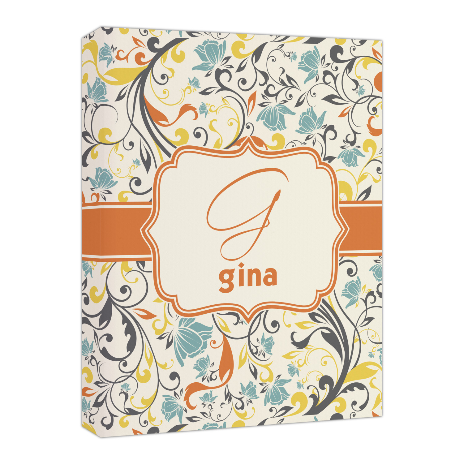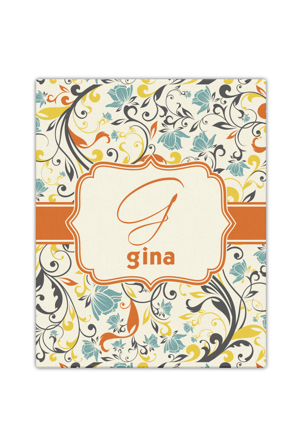 The design combines green, blue, and yellow flowers with swirls of black. The floral pattern is set on a background of white to showcase the print. The design has a classic ribbon in orange trimmed in white. The decorative white label is trimmed in orange. Add an initial and a name for that personal touch to pull the entire design together.