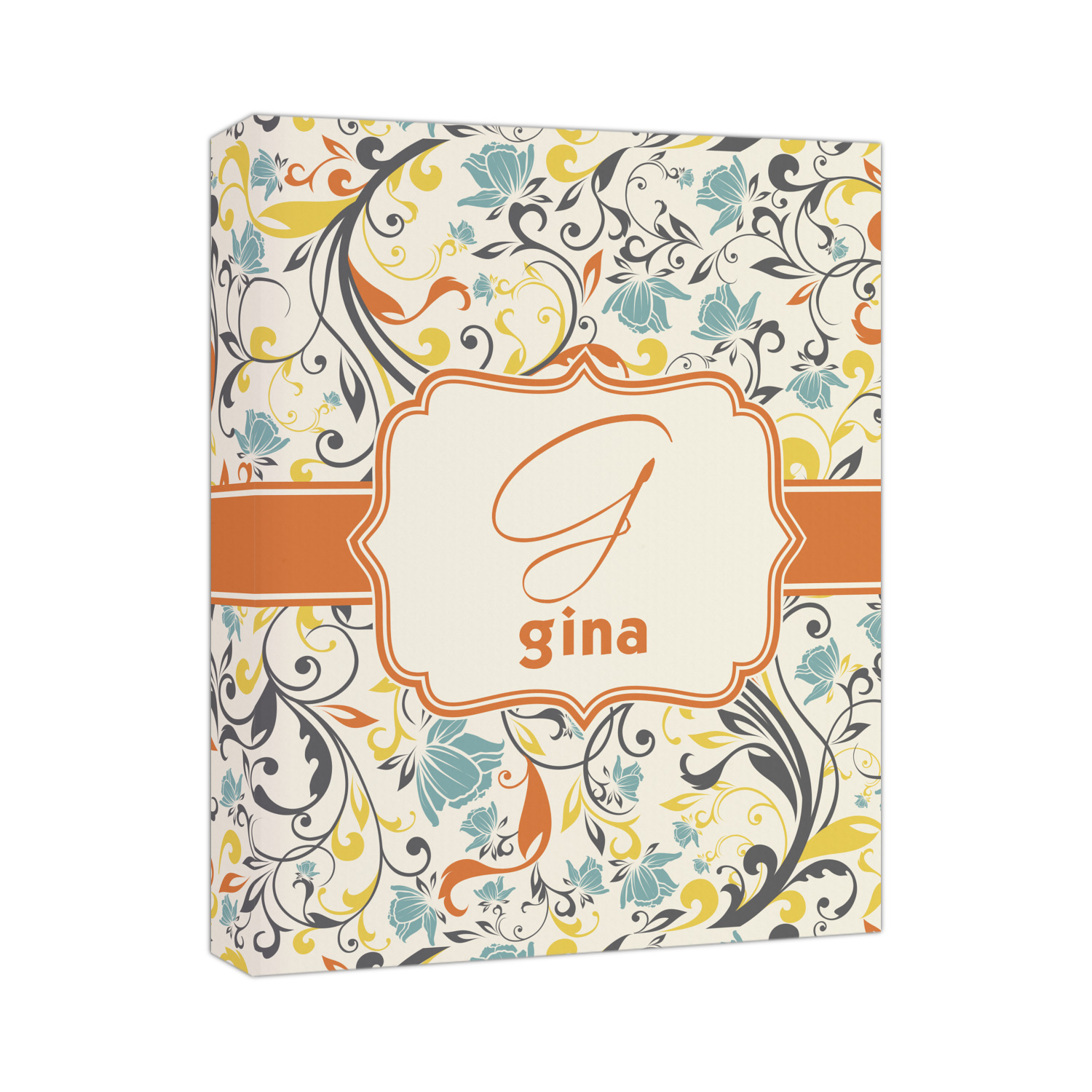 The design combines green, blue, and yellow flowers with swirls of black. The floral pattern is set on a background of white to showcase the print. The design has a classic ribbon in orange trimmed in white. The decorative white label is trimmed in orange. Add an initial and a name for that personal touch to pull the entire design together.