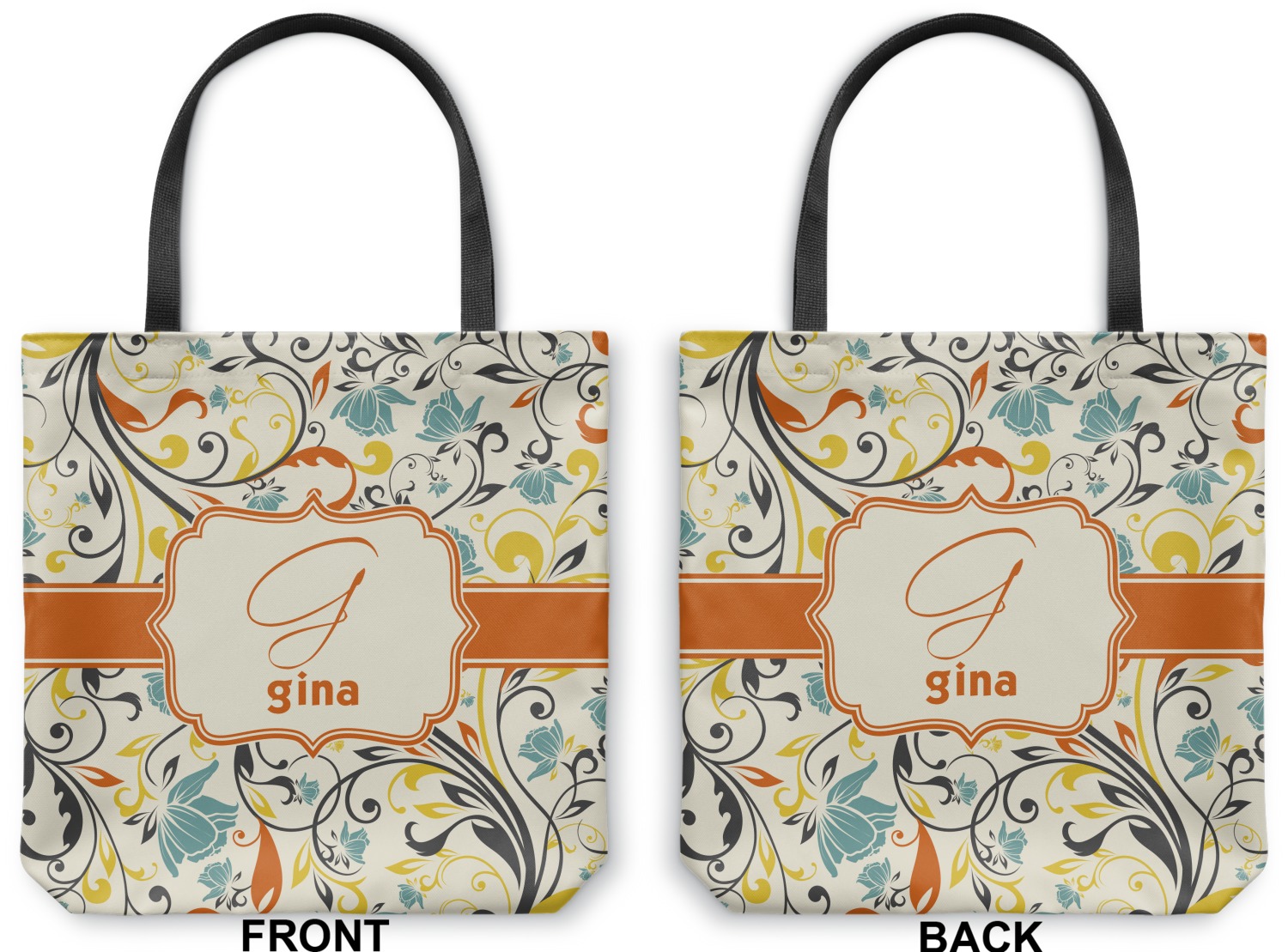 The design combines green, blue, and yellow flowers with swirls of black. The floral pattern is set on a background of white to showcase the print. The design has a classic ribbon in orange trimmed in white. The decorative white label is trimmed in orange. Add an initial and a name for that personal touch to pull the entire design together.