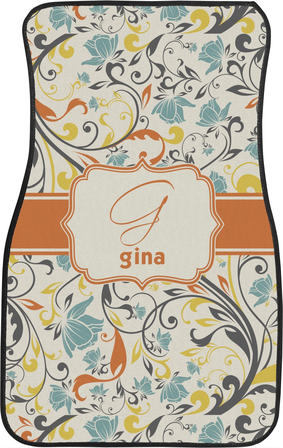The design combines green, blue, and yellow flowers with swirls of black. The floral pattern is set on a background of white to showcase the print. The design has a classic ribbon in orange trimmed in white. The decorative white label is trimmed in orange. Add an initial and a name for that personal touch to pull the entire design together.