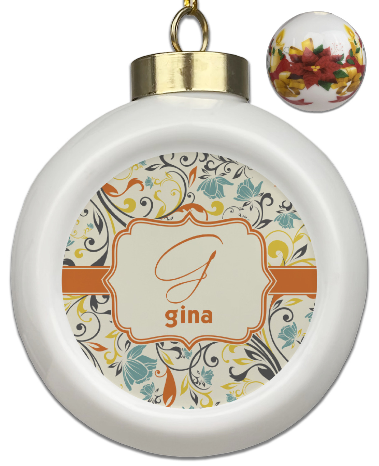 Our Christmas ornaments are a unique ceramic ball shape with a twist as it has a flat face to display your custom design! Select from one of our two design types - Christmas Tree or Poinsettia Garland - to adorn the curved back of your personal design. Each ornament measures 3H x 2.5W x 2D accompanied with a gold string accent for finishing touches to hang on your beautiful Christmas tree!