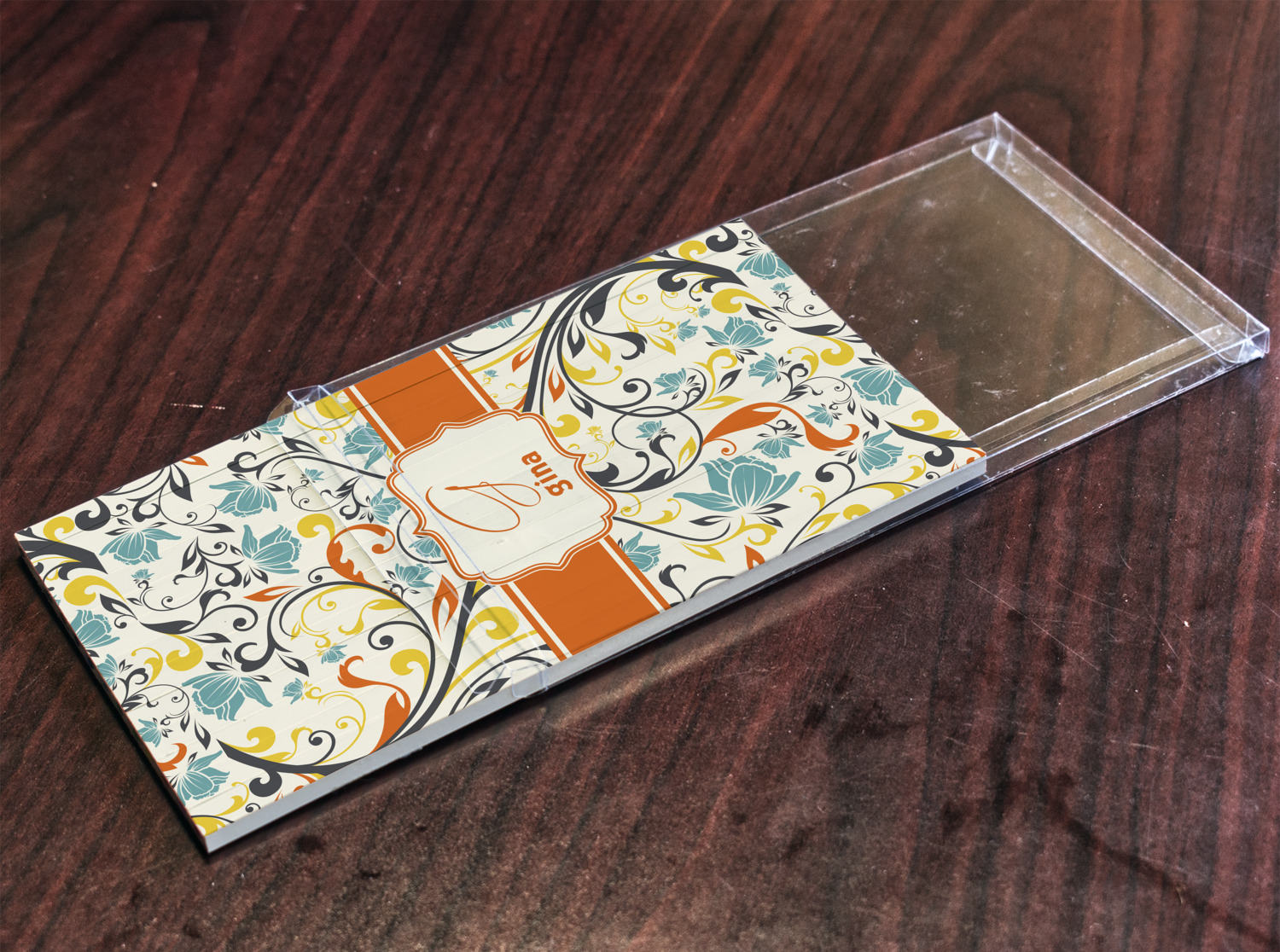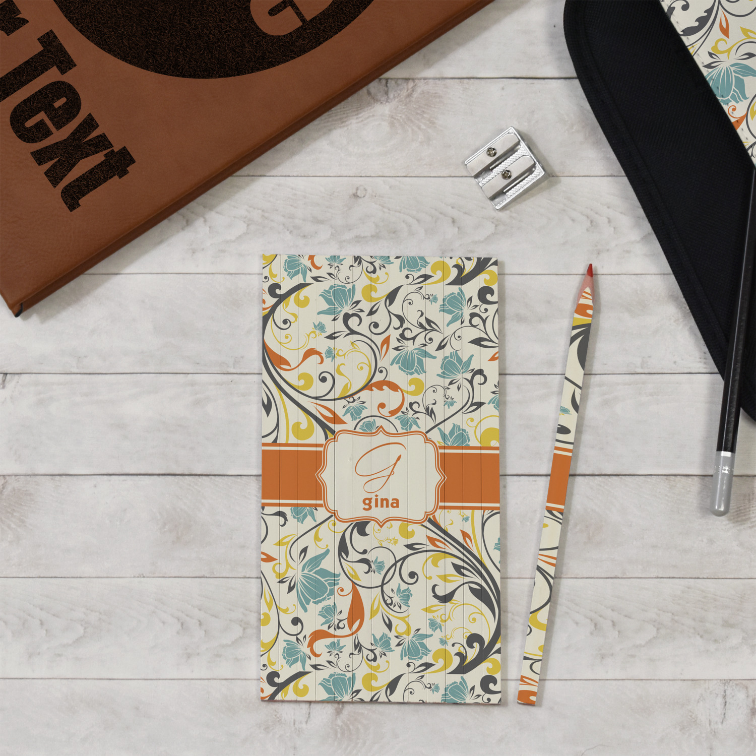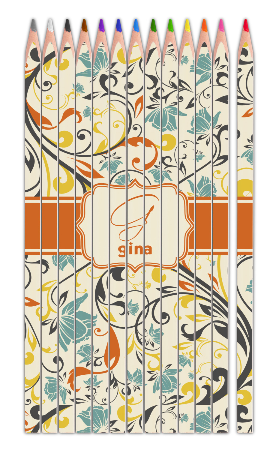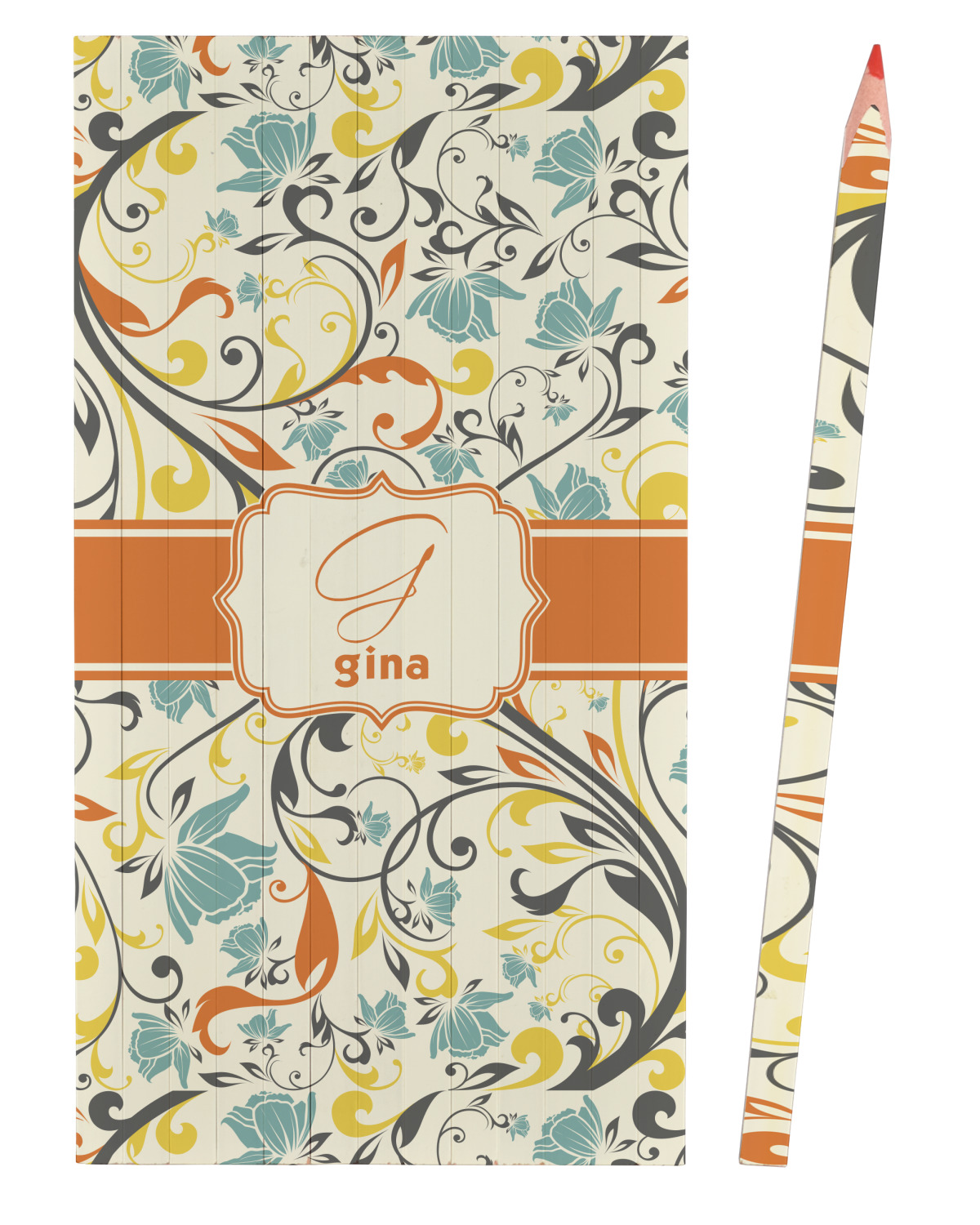 The design combines green, blue, and yellow flowers with swirls of black. The floral pattern is set on a background of white to showcase the print. The design has a classic ribbon in orange trimmed in white. The decorative white label is trimmed in orange. Add an initial and a name for that personal touch to pull the entire design together.