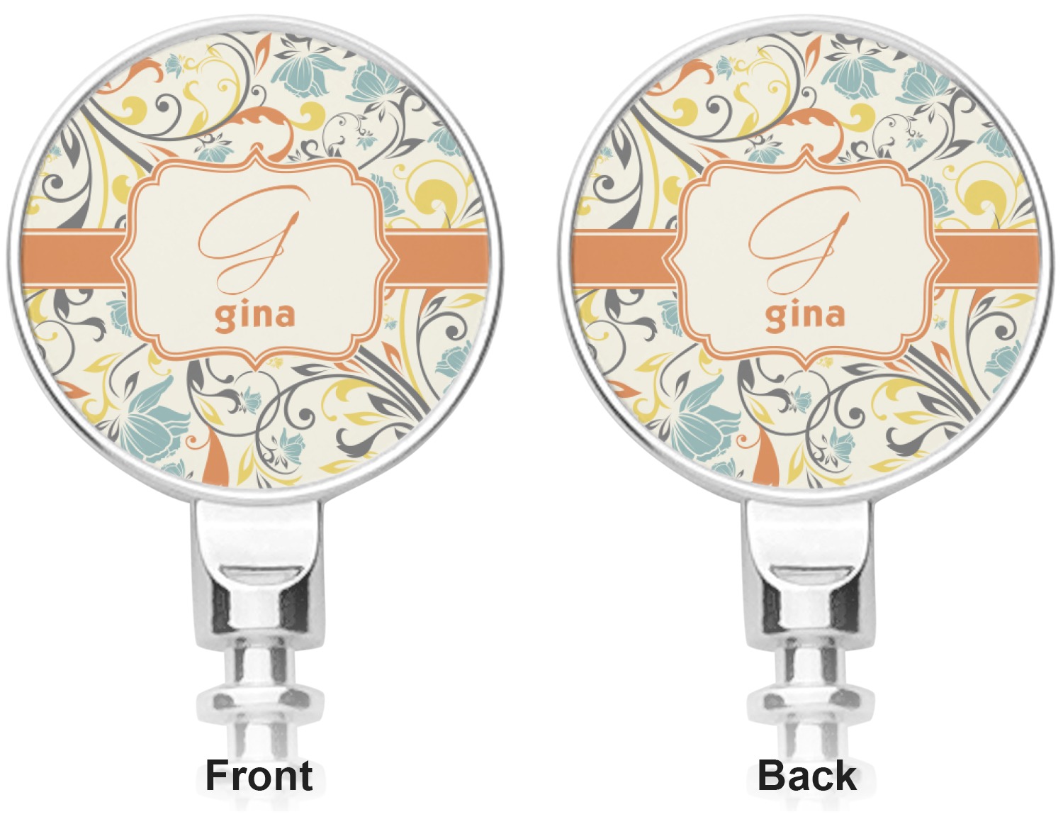The design combines green, blue, and yellow flowers with swirls of black. The floral pattern is set on a background of white to showcase the print. The design has a classic ribbon in orange trimmed in white. The decorative white label is trimmed in orange. Add an initial and a name for that personal touch to pull the entire design together.