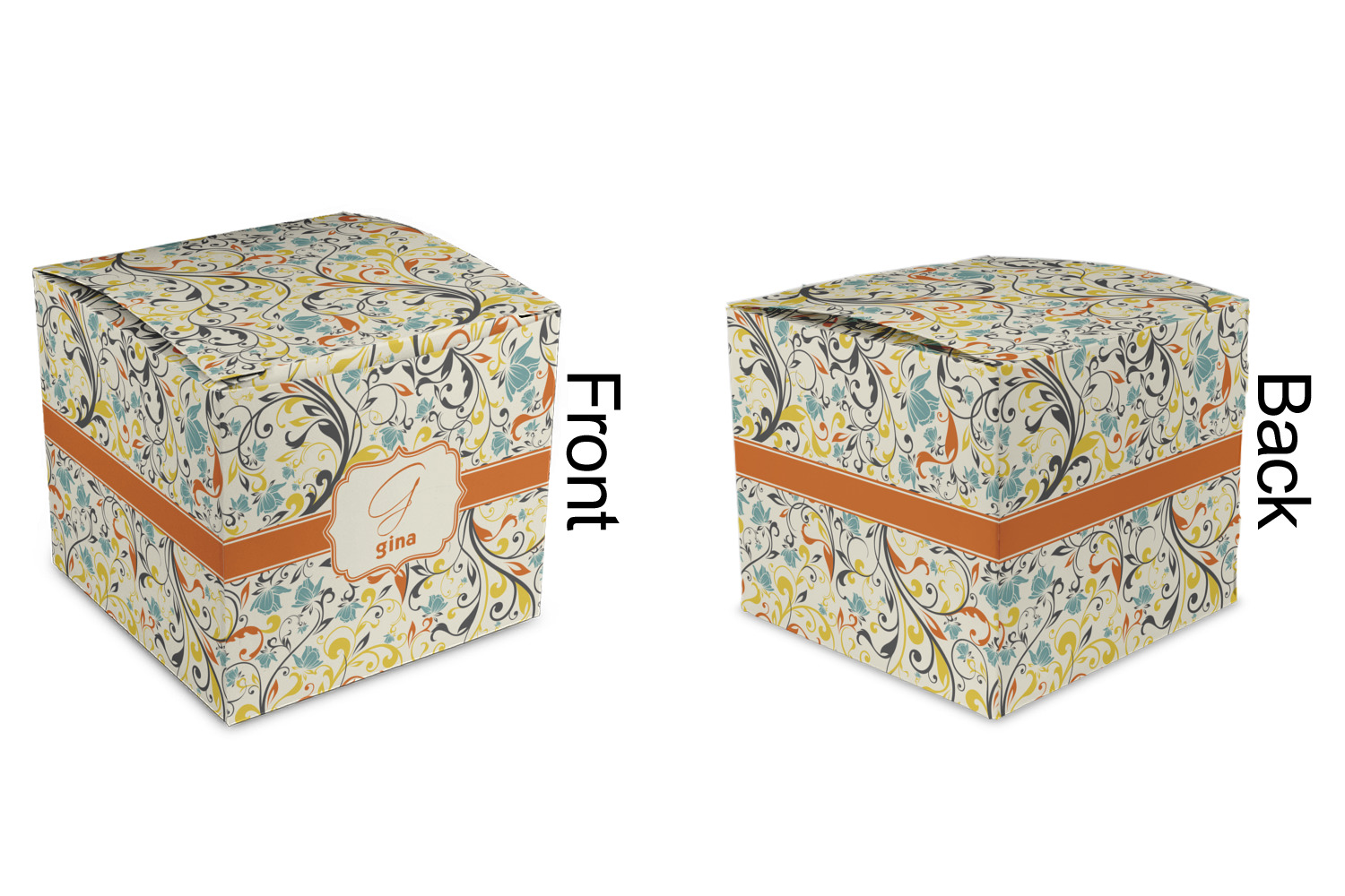 The design combines green, blue, and yellow flowers with swirls of black. The floral pattern is set on a background of white to showcase the print. The design has a classic ribbon in orange trimmed in white. The decorative white label is trimmed in orange. Add an initial and a name for that personal touch to pull the entire design together.