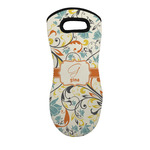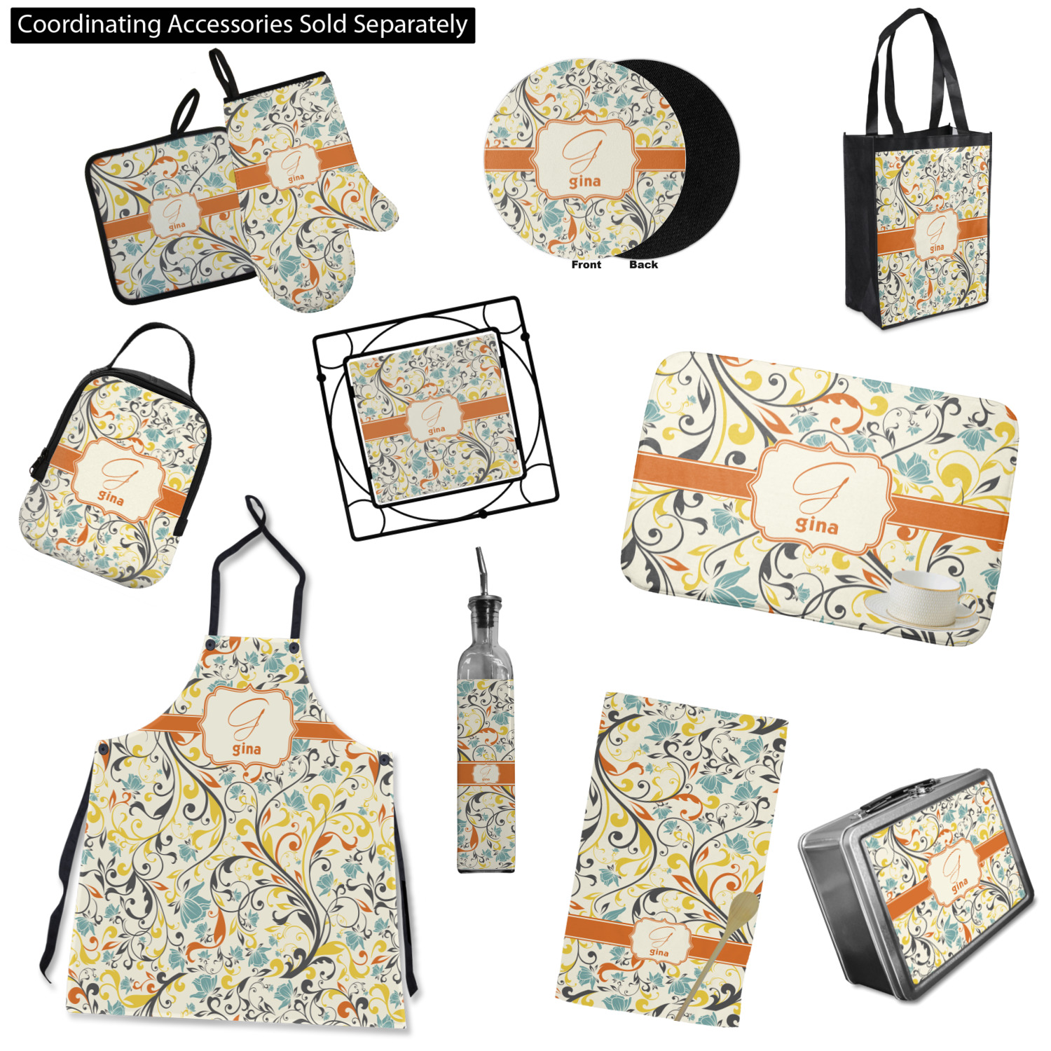 The design combines green, blue, and yellow flowers with swirls of black. The floral pattern is set on a background of white to showcase the print. The design has a classic ribbon in orange trimmed in white. The decorative white label is trimmed in orange. Add an initial and a name for that personal touch to pull the entire design together.