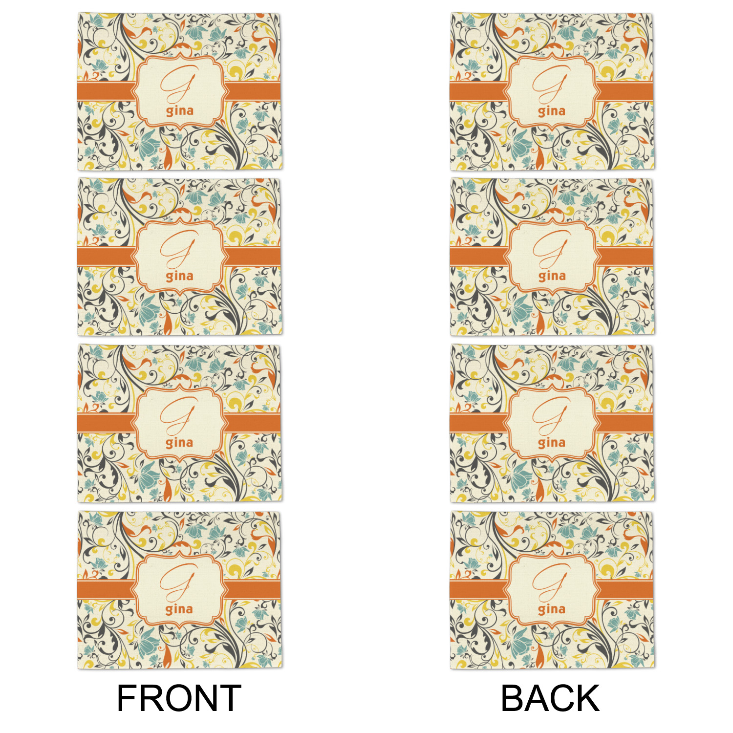 The design combines green, blue, and yellow flowers with swirls of black. The floral pattern is set on a background of white to showcase the print. The design has a classic ribbon in orange trimmed in white. The decorative white label is trimmed in orange. Add an initial and a name for that personal touch to pull the entire design together.