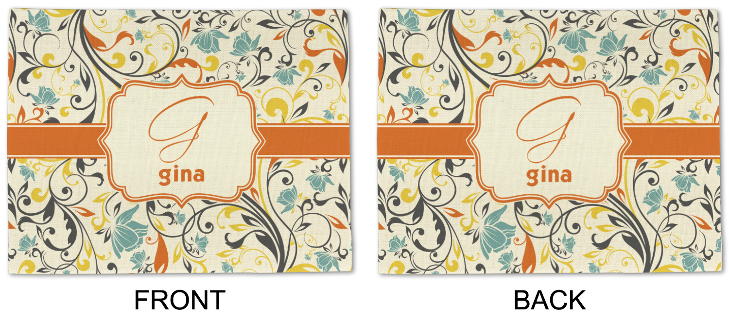 The design combines green, blue, and yellow flowers with swirls of black. The floral pattern is set on a background of white to showcase the print. The design has a classic ribbon in orange trimmed in white. The decorative white label is trimmed in orange. Add an initial and a name for that personal touch to pull the entire design together.