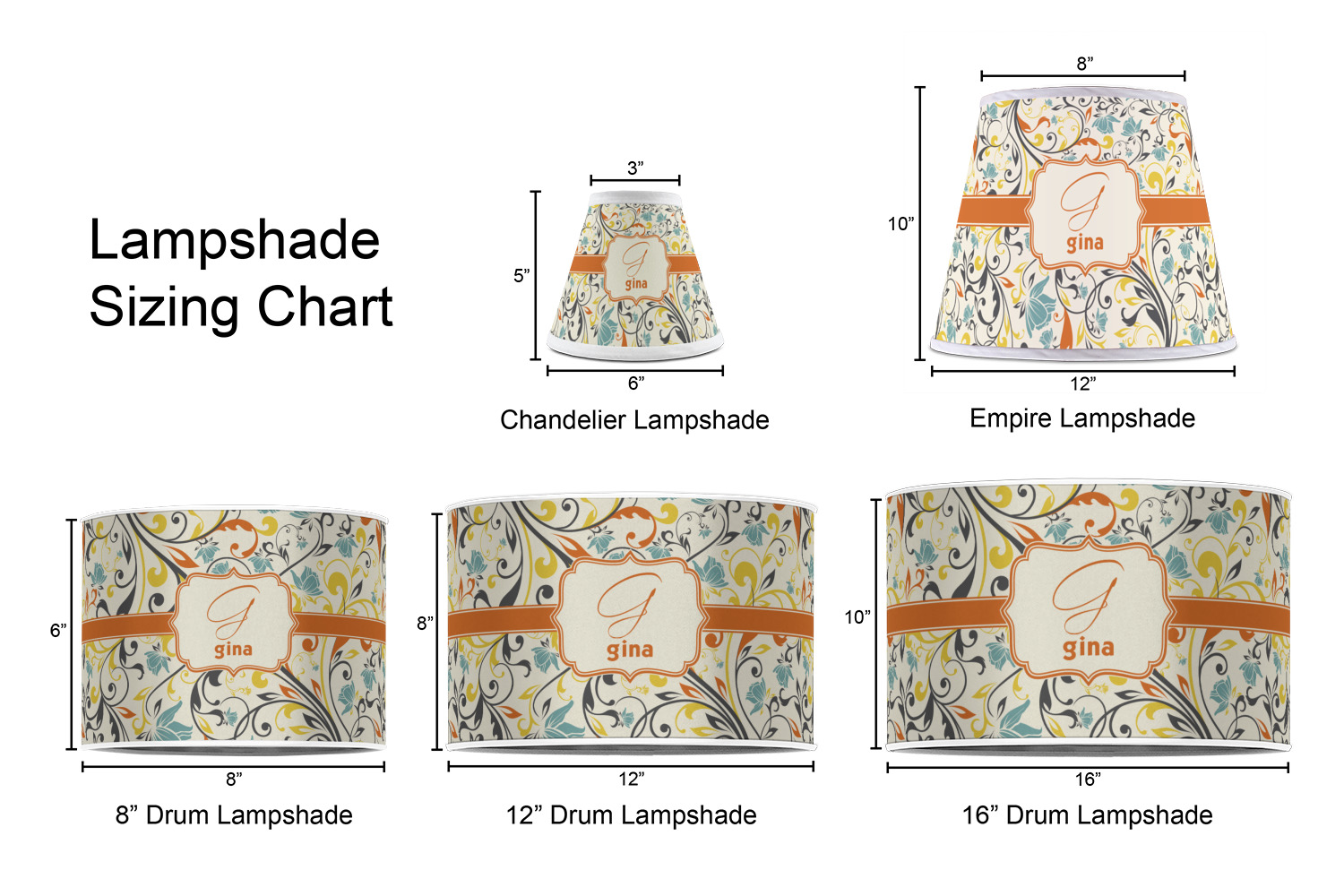 Our customized lamp shades also come in 3 different sizes: 8", 12" and 16", measuring at 8" in diameter by 6" tall, 12" in diameter by 8" tall, and 16" in diameter by 10" tall, respectively.