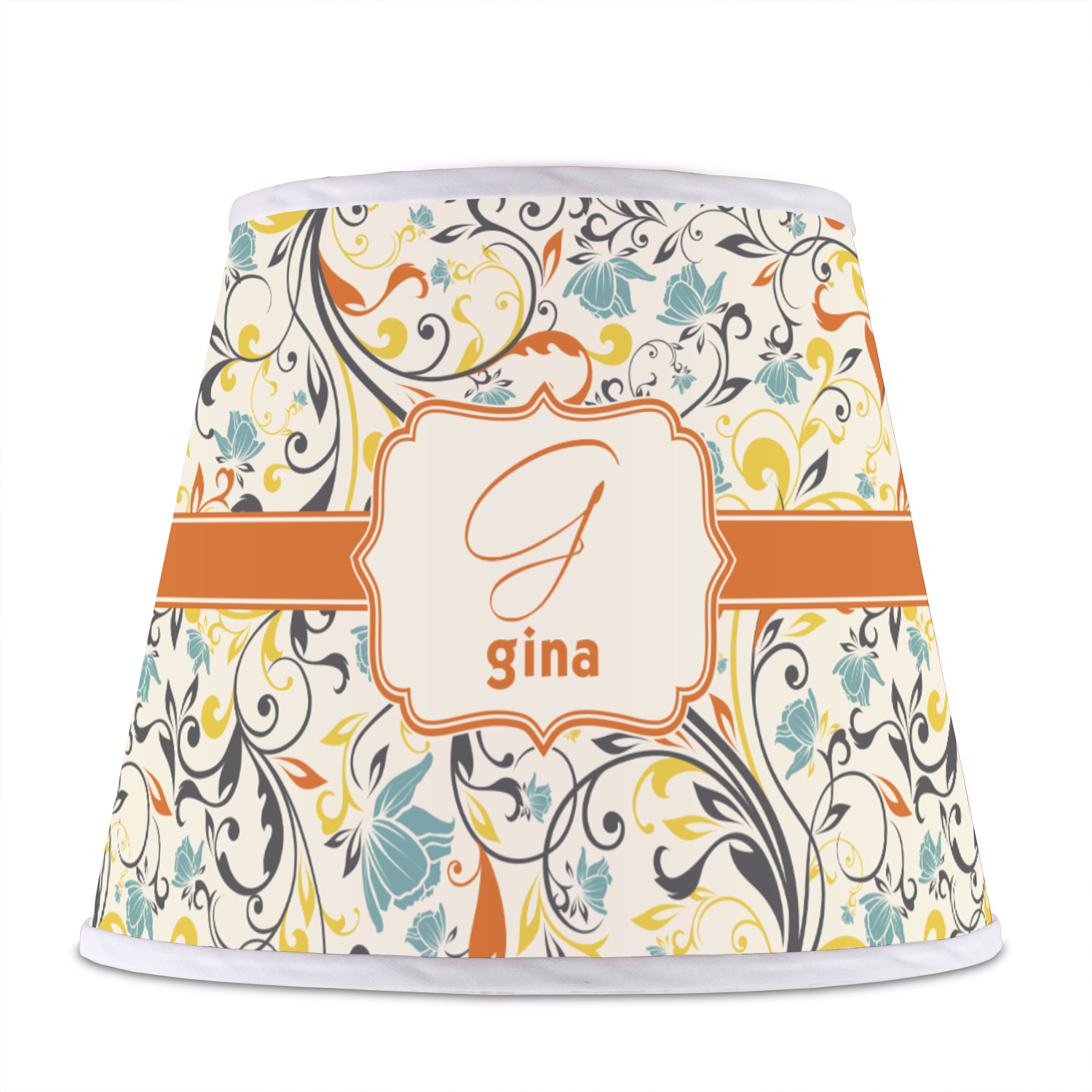 The design combines green, blue, and yellow flowers with swirls of black. The floral pattern is set on a background of white to showcase the print. The design has a classic ribbon in orange trimmed in white. The decorative white label is trimmed in orange. Add an initial and a name for that personal touch to pull the entire design together.