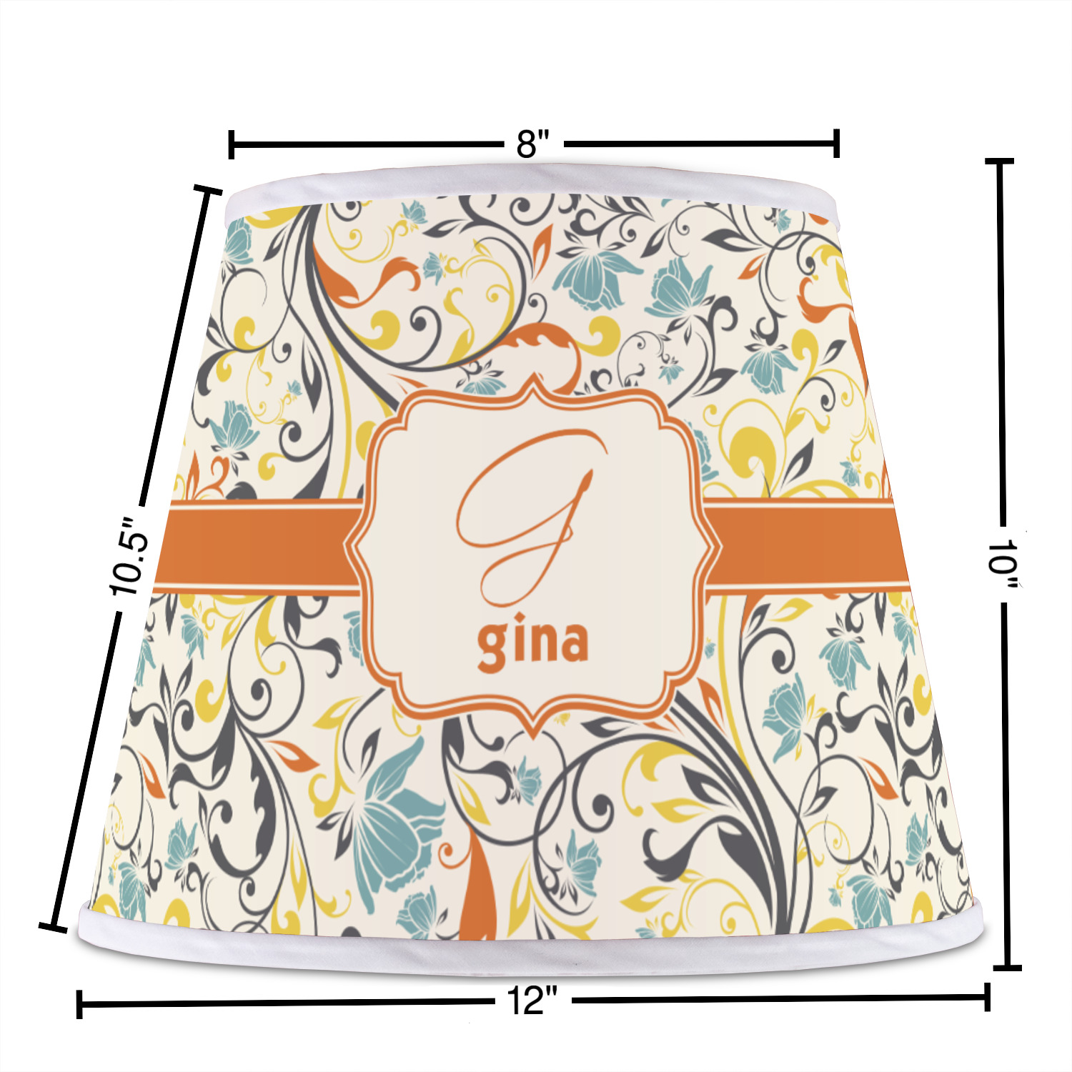 The base of this lampshade is 12 inches in diameter, and the top spans 8 inches in diameter. The total height of the lampshade is 10 inches. The angled nature of this custom lampshade concentrates the light, making it ideal for smaller spaces. This lampshade is made of matte, polyfilm, and displays your customization in its middle. The top and bottom of this colorful lamp shade are lined with a white fabric ribbon (which can be replaced with black inside the design studio) which frames your design and creates a sophisticated finish. As an UNO fitter lampshade, this unique lamp shade will fit a variety of bases.