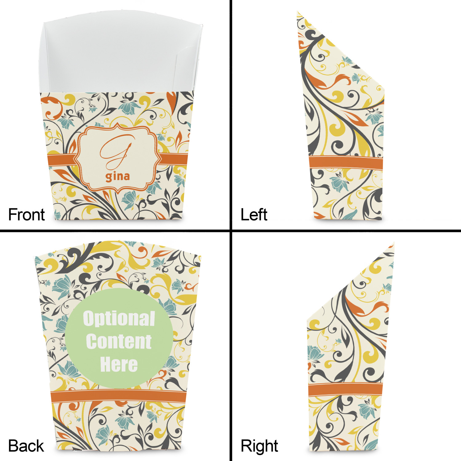 The design combines green, blue, and yellow flowers with swirls of black. The floral pattern is set on a background of white to showcase the print. The design has a classic ribbon in orange trimmed in white. The decorative white label is trimmed in orange. Add an initial and a name for that personal touch to pull the entire design together.