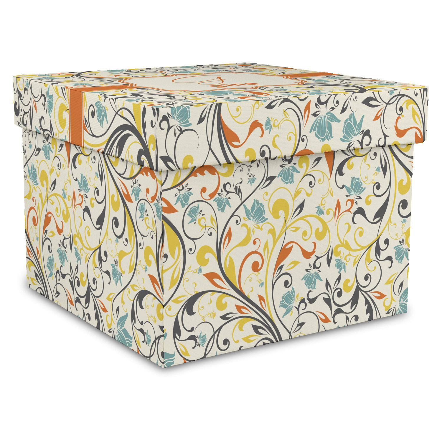 The design combines green, blue, and yellow flowers with swirls of black. The floral pattern is set on a background of white to showcase the print. The design has a classic ribbon in orange trimmed in white. The decorative white label is trimmed in orange. Add an initial and a name for that personal touch to pull the entire design together.