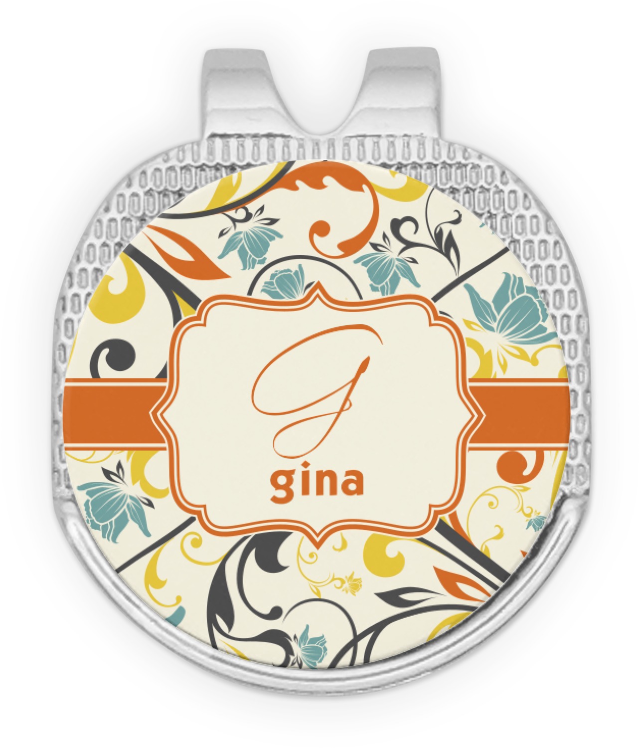 The design combines green, blue, and yellow flowers with swirls of black. The floral pattern is set on a background of white to showcase the print. The design has a classic ribbon in orange trimmed in white. The decorative white label is trimmed in orange. Add an initial and a name for that personal touch to pull the entire design together.