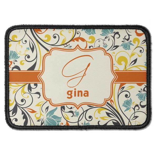 The design combines green, blue, and yellow flowers with swirls of black. The floral pattern is set on a background of white to showcase the print. The design has a classic ribbon in orange trimmed in white. The decorative white label is trimmed in orange. Add an initial and a name for that personal touch to pull the entire design together.