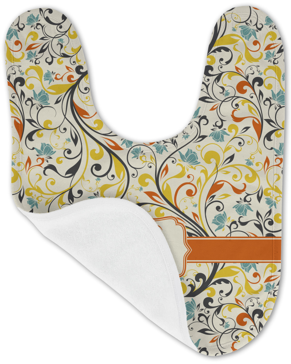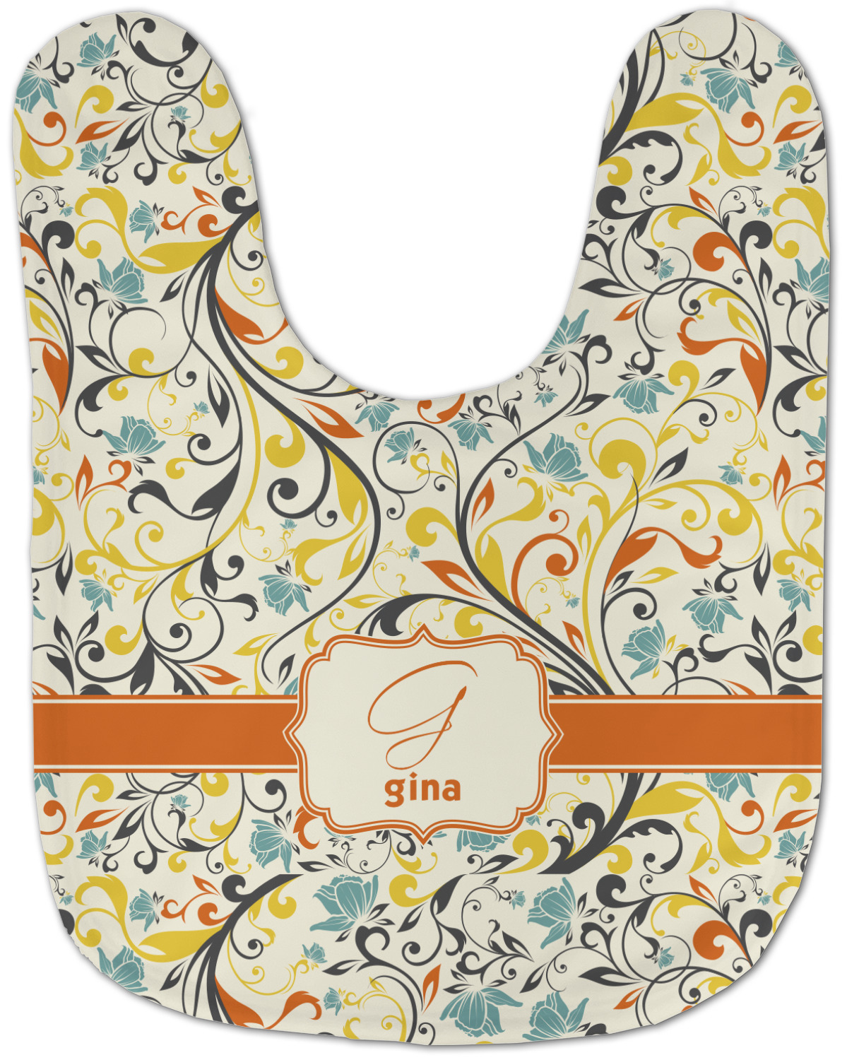 The design combines green, blue, and yellow flowers with swirls of black. The floral pattern is set on a background of white to showcase the print. The design has a classic ribbon in orange trimmed in white. The decorative white label is trimmed in orange. Add an initial and a name for that personal touch to pull the entire design together.