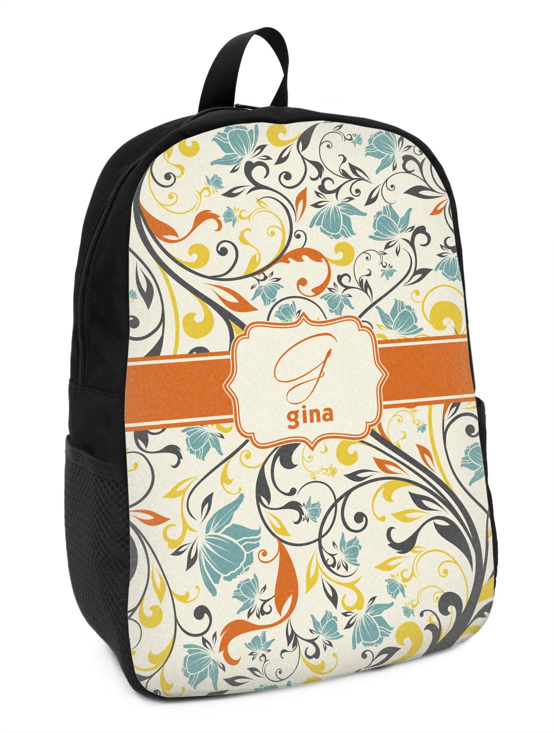 These small backpacks are made of a durable black canvas material with your personalization right on the front. The two shoulder straps are padded and easily adjustable. The bag itself measures at about 11" W x 15" H x 5" D. It's the perfect size for elementary aged kids or adults who want a smaller backpack. On the top of the bag you will find a handle to hang or carry your backpack by as well as a large zipper closure to keep all of your belongings safe inside. On each side of your backpack is a mesh pocket for a small item or water bottle. Inside your backpack you will find a spacious area with a small zipper pocket and a padded laptop slot that will fit up to a 13" laptop (13" being very snug). This is the perfect bag for any student that needs a couple books and their laptop with them at all times. It also works great as a carry on for traveling!